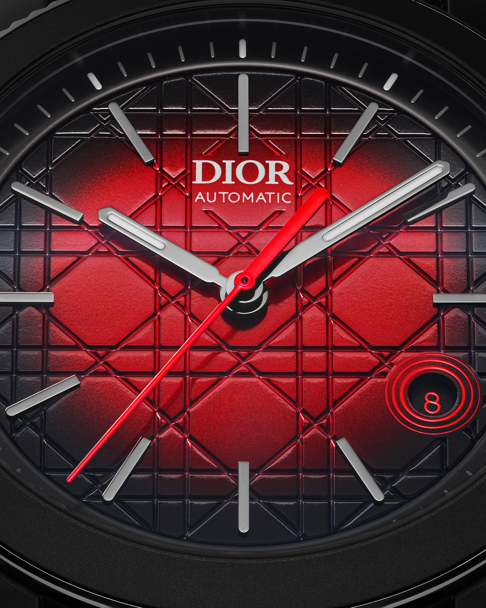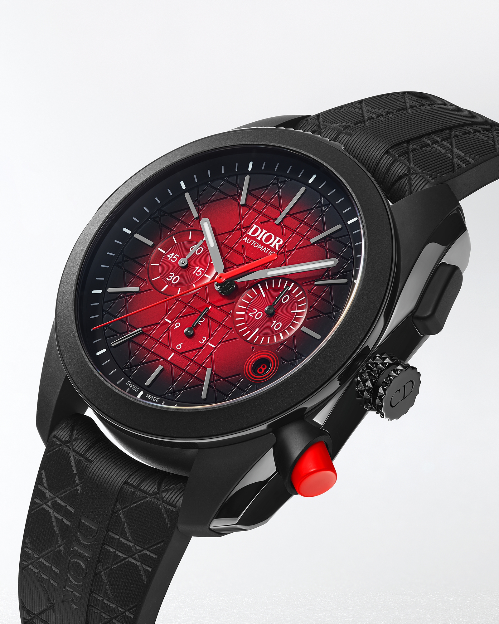 DIOR 经典符号凸显 CHIFFRE ROUGE 的鲜明个性:表盘和背面的摆轮均饰以藤格纹,日期显示盘上则点缀以红色的迪奥先生的幸运数字 8,展现非凡魅力。