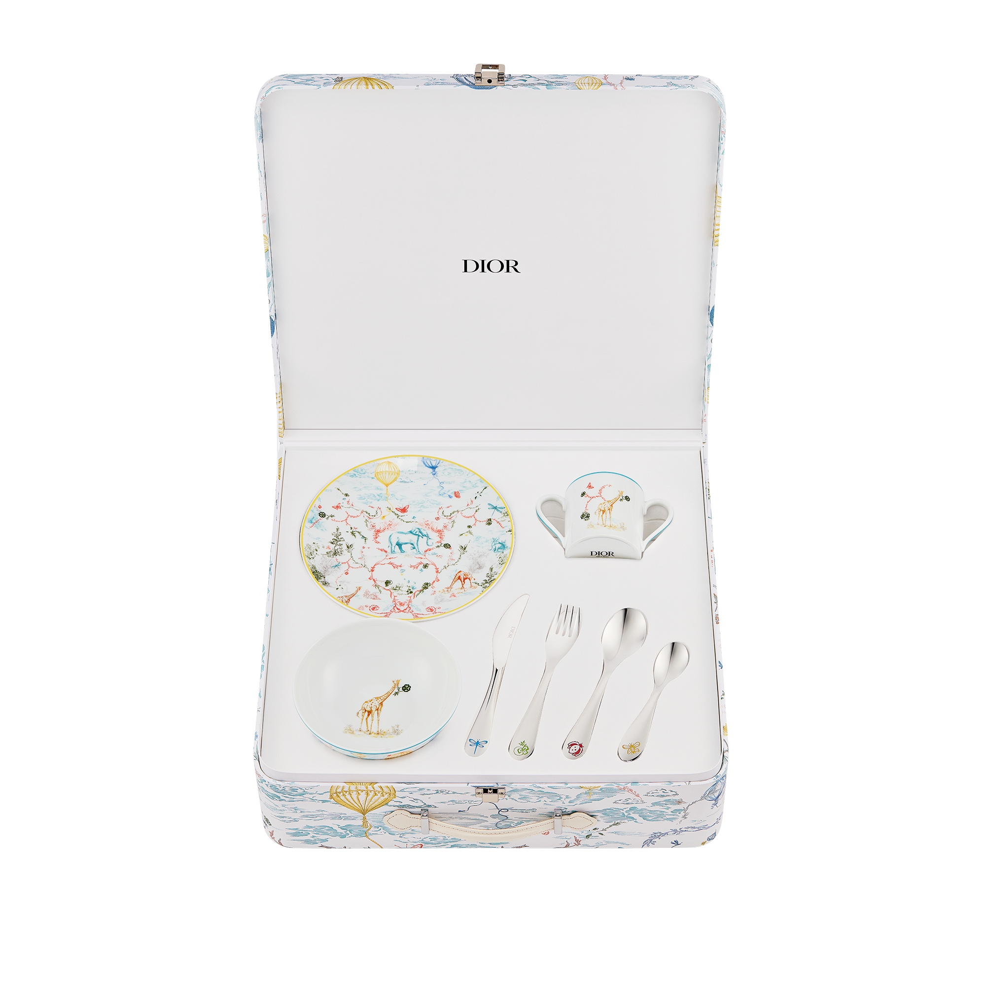 Dior Maison 系列从梦幻世界汲取灵感,打造饰以茹伊印花图案的儿童餐具。由科迪莉娅·德卡斯特兰 (Cordelia de Castellane) 采用柔和的色调重新演绎,饰以长颈鹿、大象或蝴蝶和热气球,丰富 Baby Dior 系列。