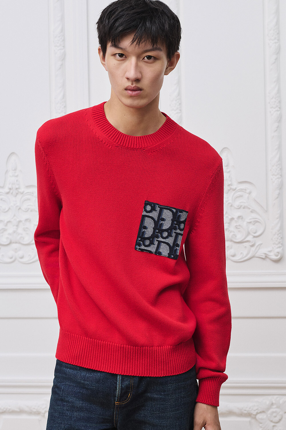 海军蓝色和红色绵羊毛和山羊绒混纺面料 Dior 标志