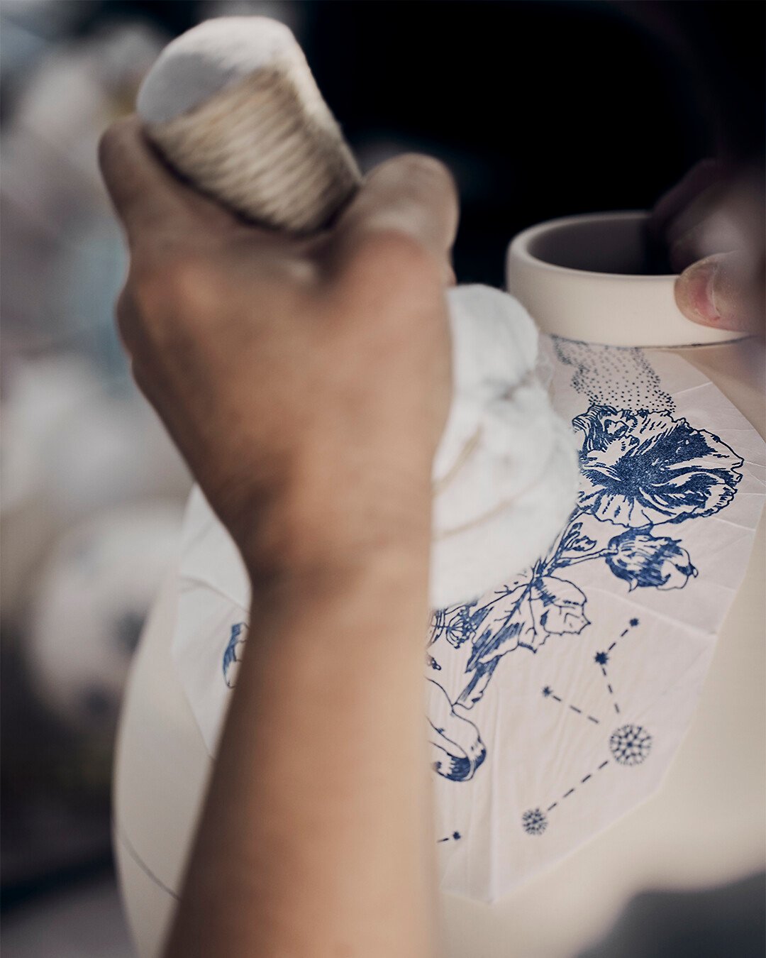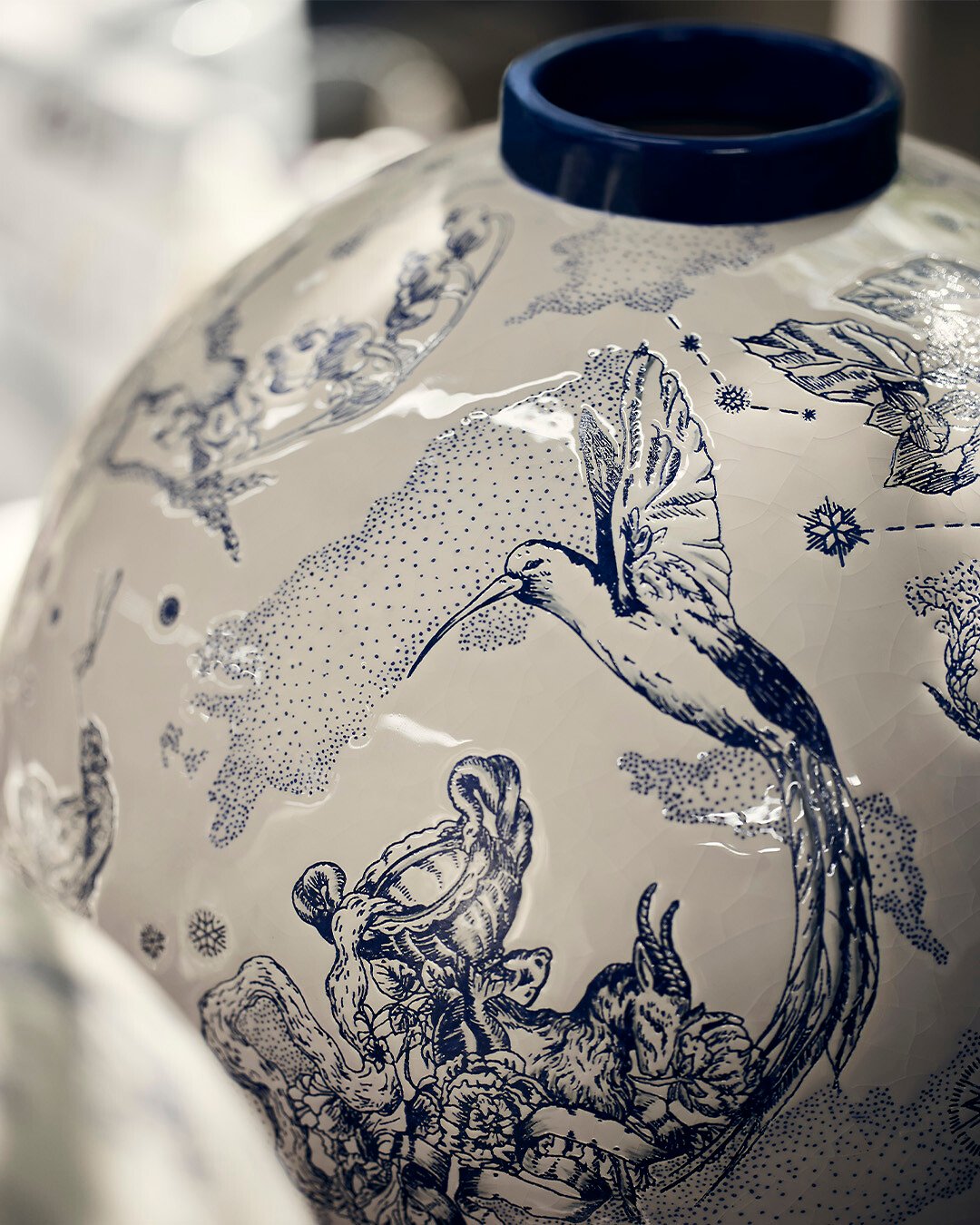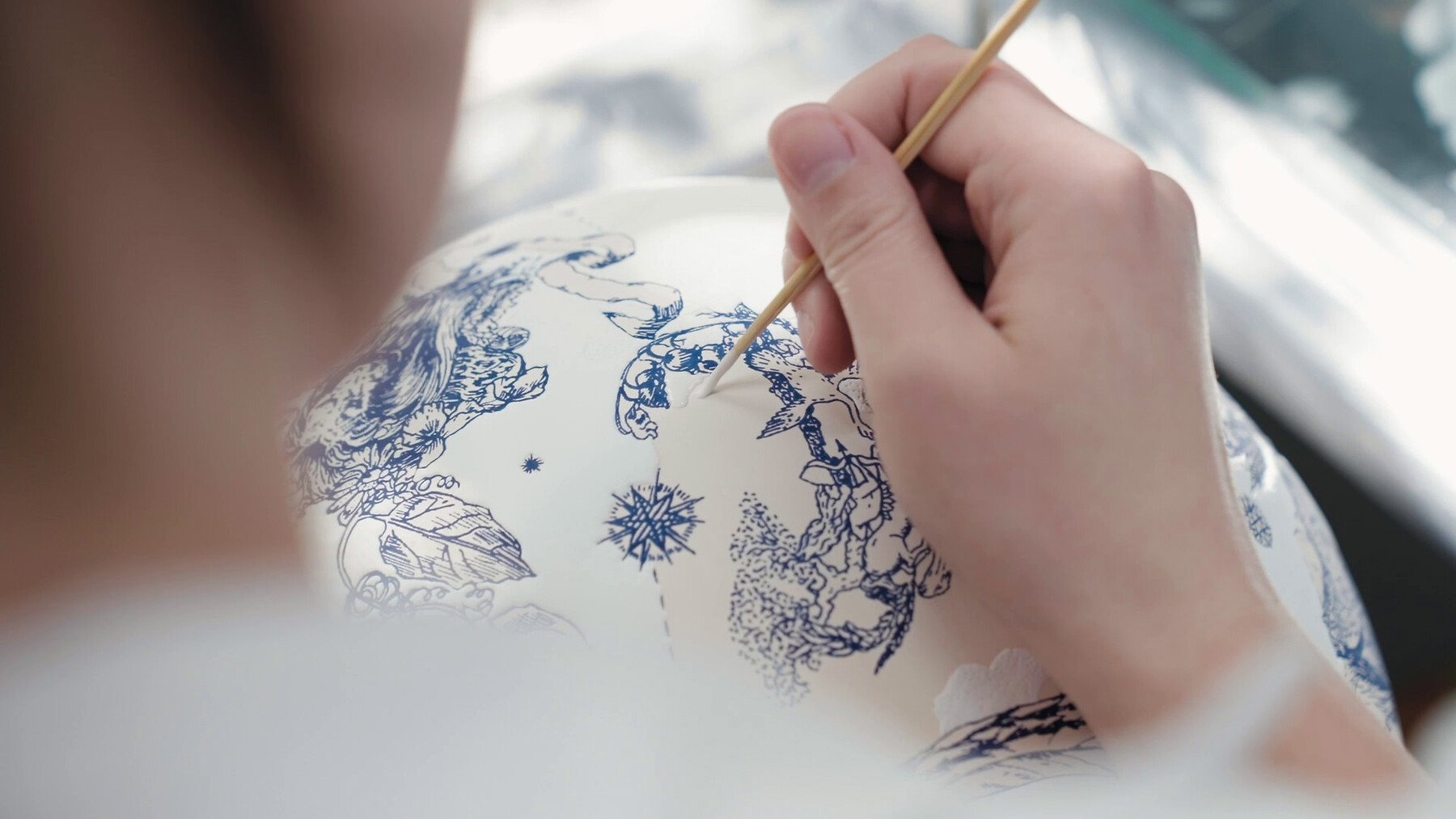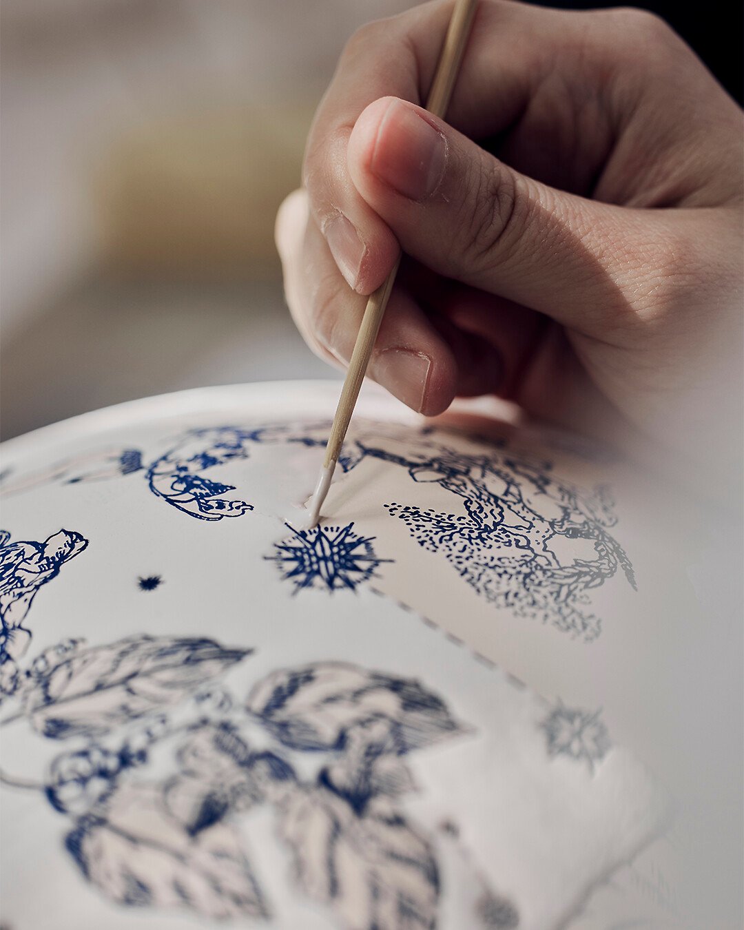 迪奥工匠以一系列精确娴熟的高超工艺将原材料塑造成每一件单品的原型,随后借助巧妙的薄纸转印技术,以迷人的图案装点经过烧制的陶器。再以尖笔逐滴点缀釉料,突显精致图案的优美韵致。