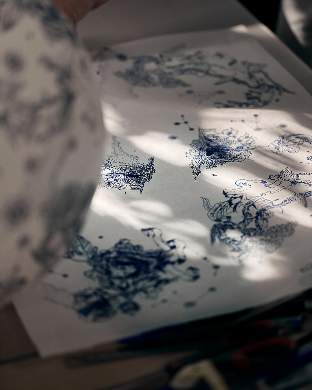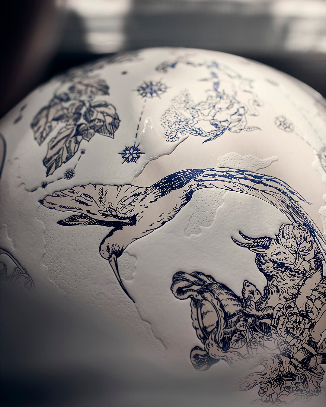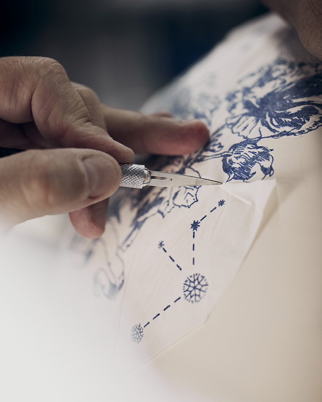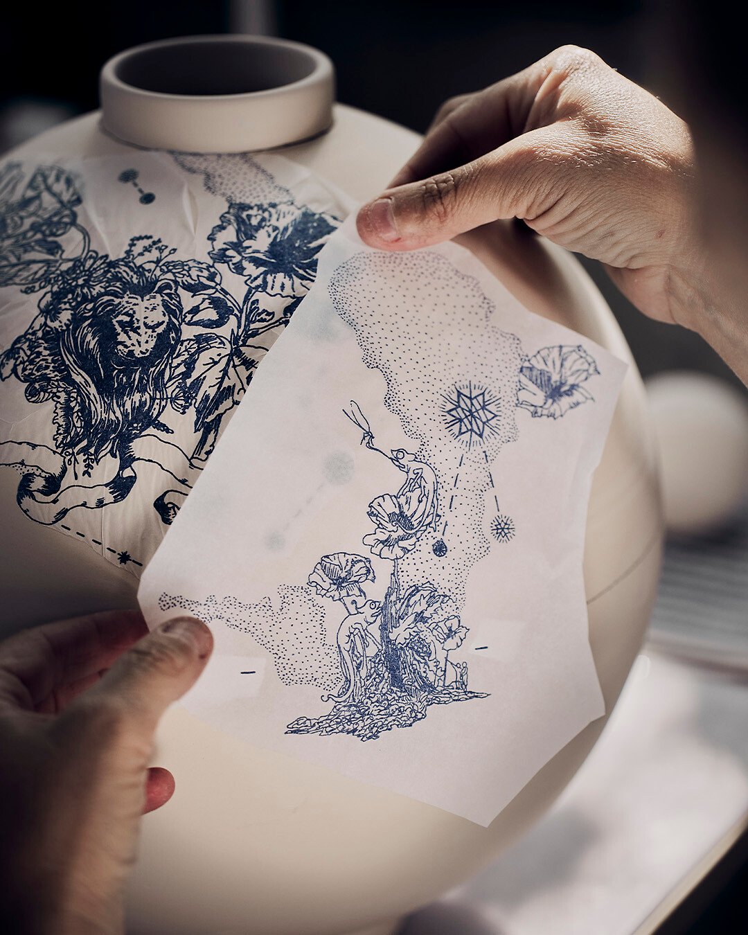 迪奥工匠以一系列精确娴熟的高超工艺将原材料塑造成每一件单品的原型,随后借助巧妙的薄纸转印技术,以迷人的图案装点经过烧制的陶器。再以尖笔逐滴点缀釉料,突显精致图案的优美韵致。