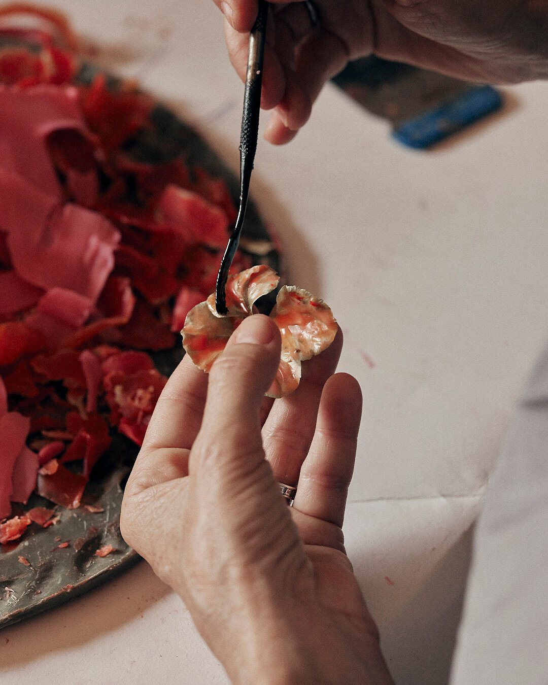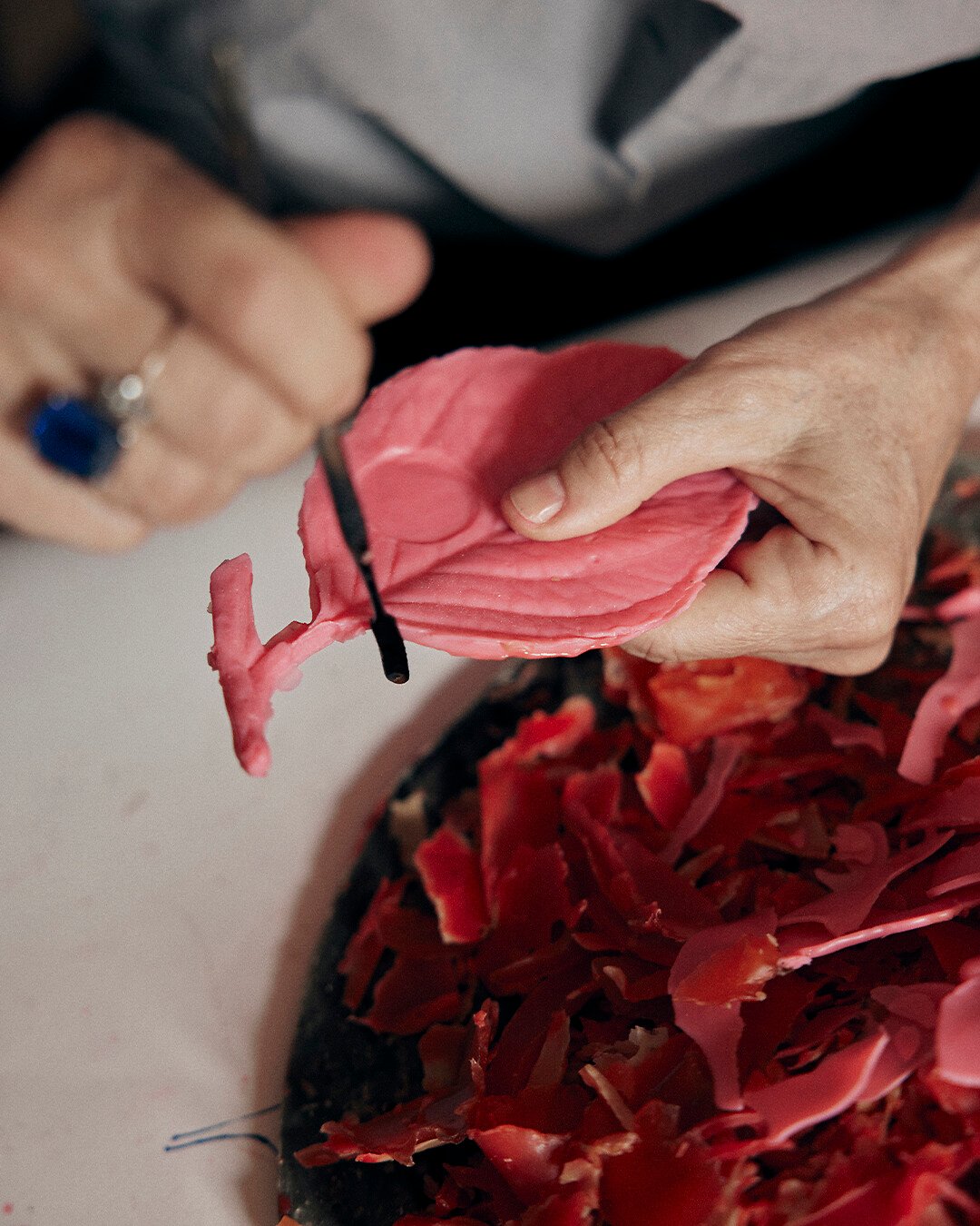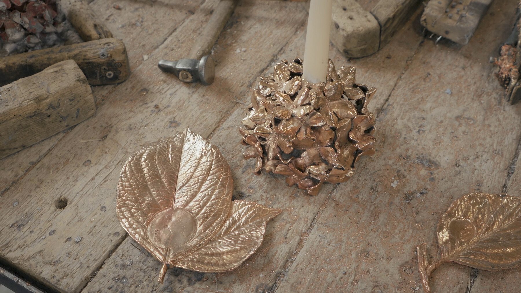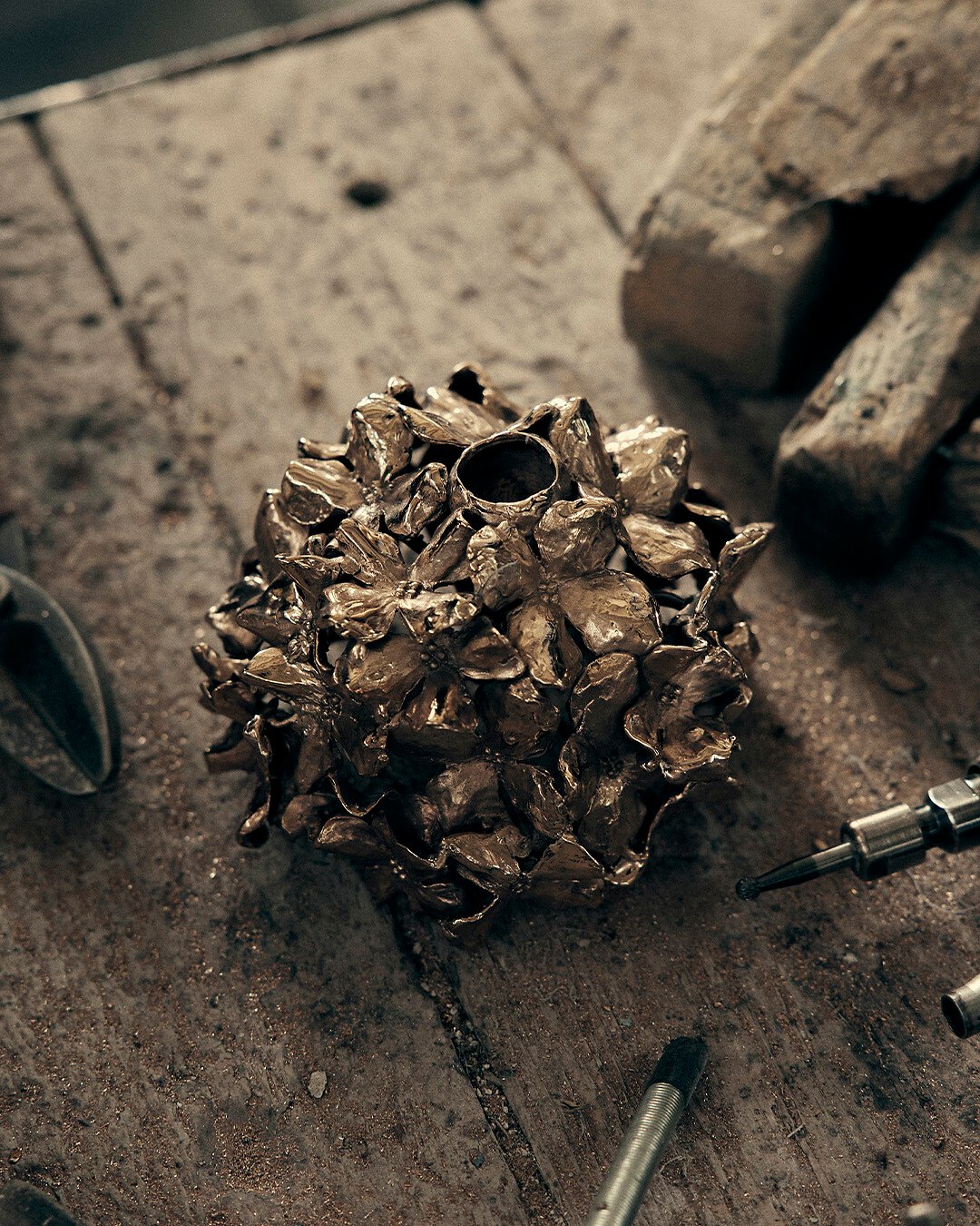她为迪奥设计了一系列装饰性青铜物件,融合了不同的非凡精湛工艺:每一件作品均采用失蜡铸造法手工打造。这种技法是在蜡模熔失后形成的空腔中注入熔融金属成型,从罗丹 (RODIN) 到卡米耶·克洛岱尔 (CAMILLE CLAUDEL) 等雕塑大师都青睐此工艺。这是一场引人入胜的对话,迪奥品牌钟情的植物世界之美与非凡的现代工艺相互交融,绽放出动人的光彩。