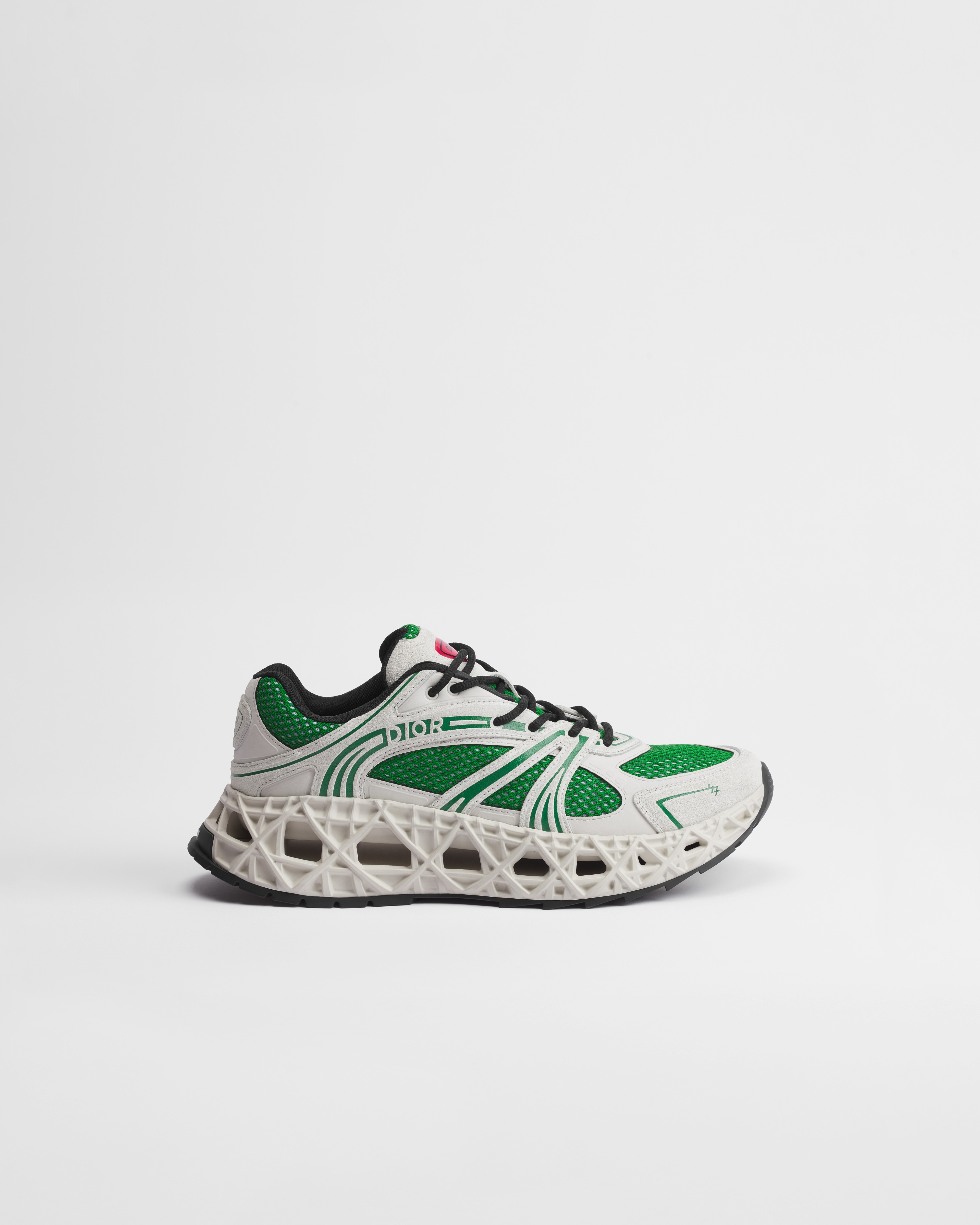 这款 B35 NXXT 运动鞋彰显别具一格的未来主义魅力。体现建筑美学结构的白色镂空鞋底展示藤格纹图案,彰显 Dior 精湛的创新工艺。鞋底宽松轻盈,拥有非凡的稳定性,为精美的轮廓增添活力。白色绒面牛皮革、白色科技面料和双层绿色网眼织物鞋面,形成巧妙对比,回溯 1990 年代跑鞋设计。图形风格线条时尚现代,饰以高频 Dior 和 47 标志,鞋舌和鞋跟则饰以 Dior B35 补丁,作为精妙点睛之笔。可带来出色的舒适感和稳定性。