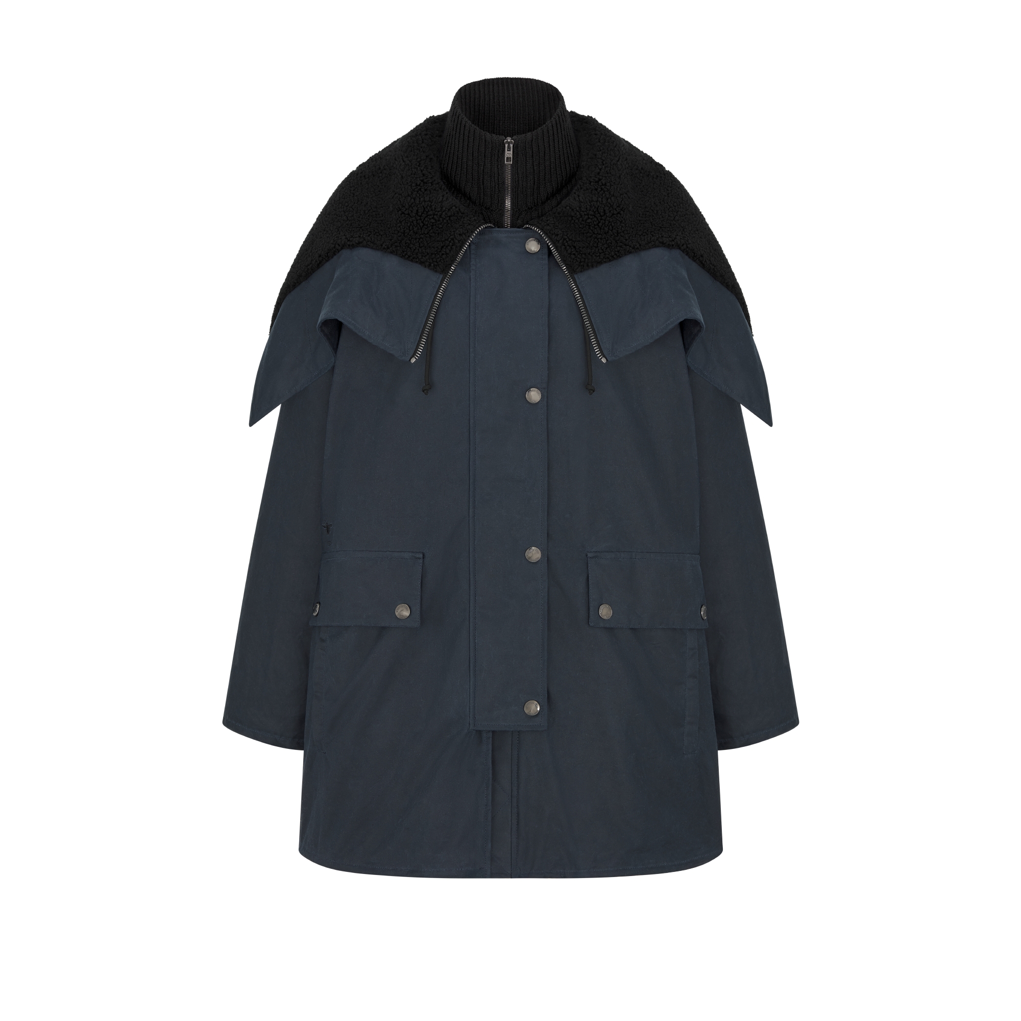 深蓝色涂层棉质帆布搭配拉链风帽和可拆卸衣领