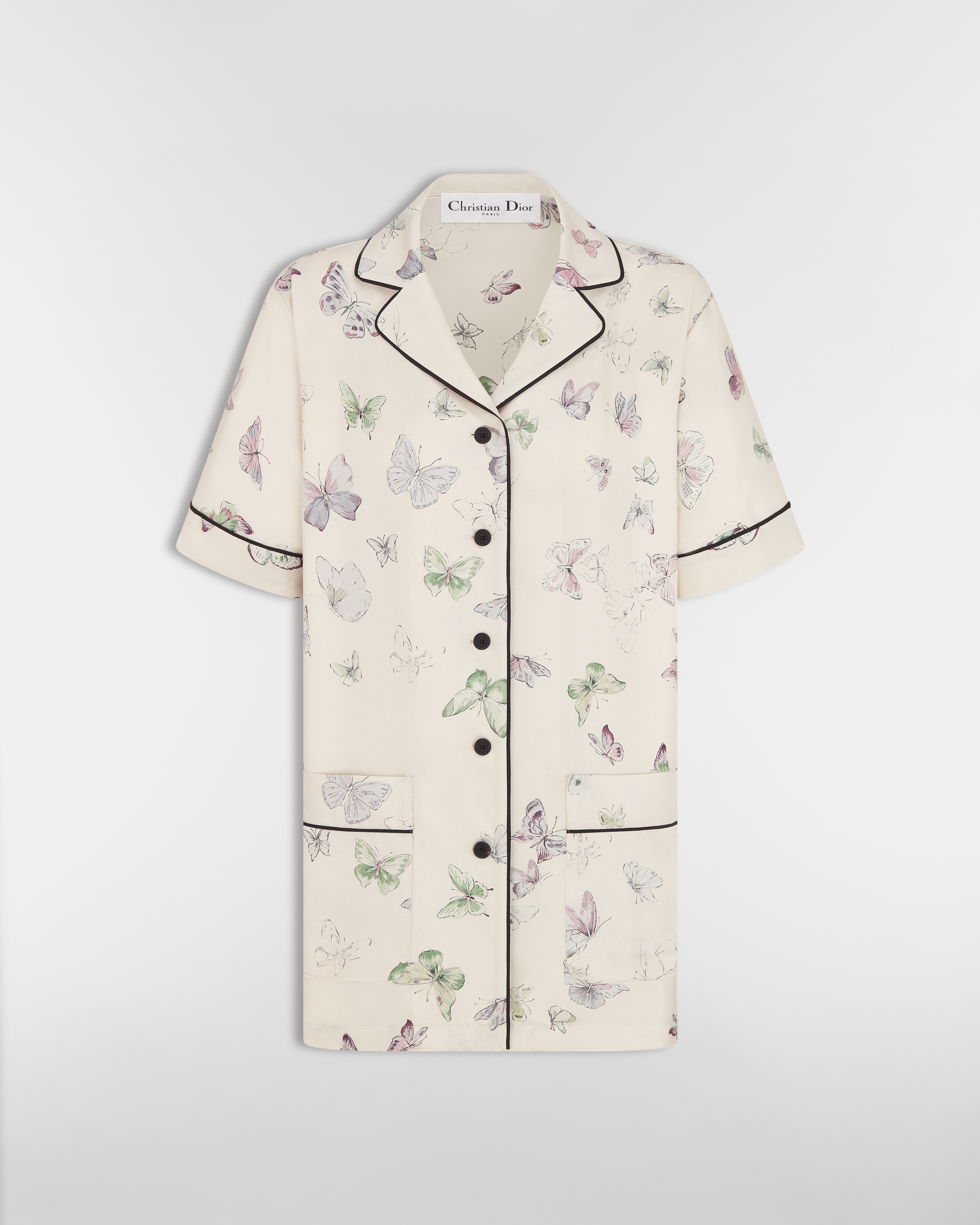 米白色桑蚕丝斜纹面料多色蝴蝶图案