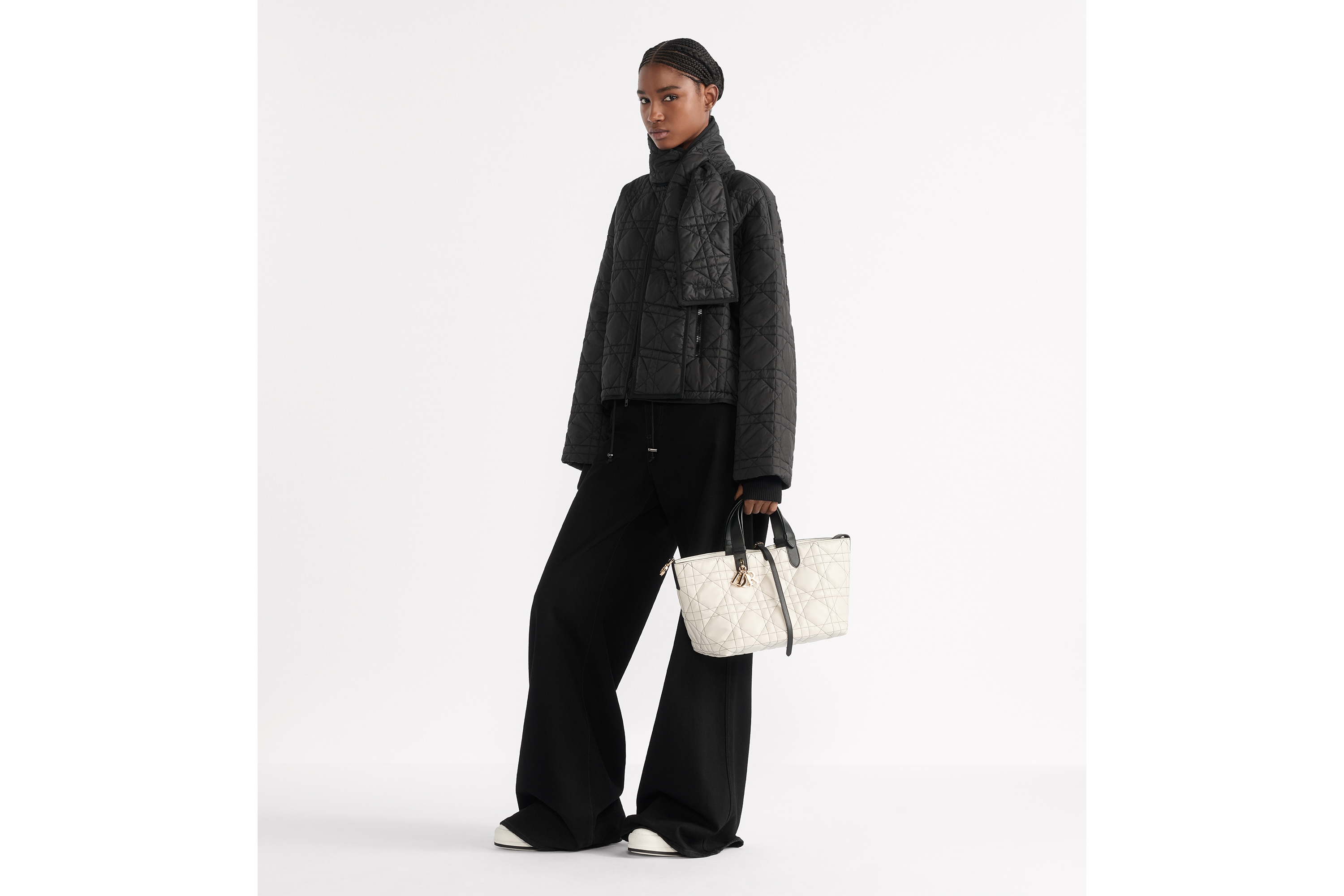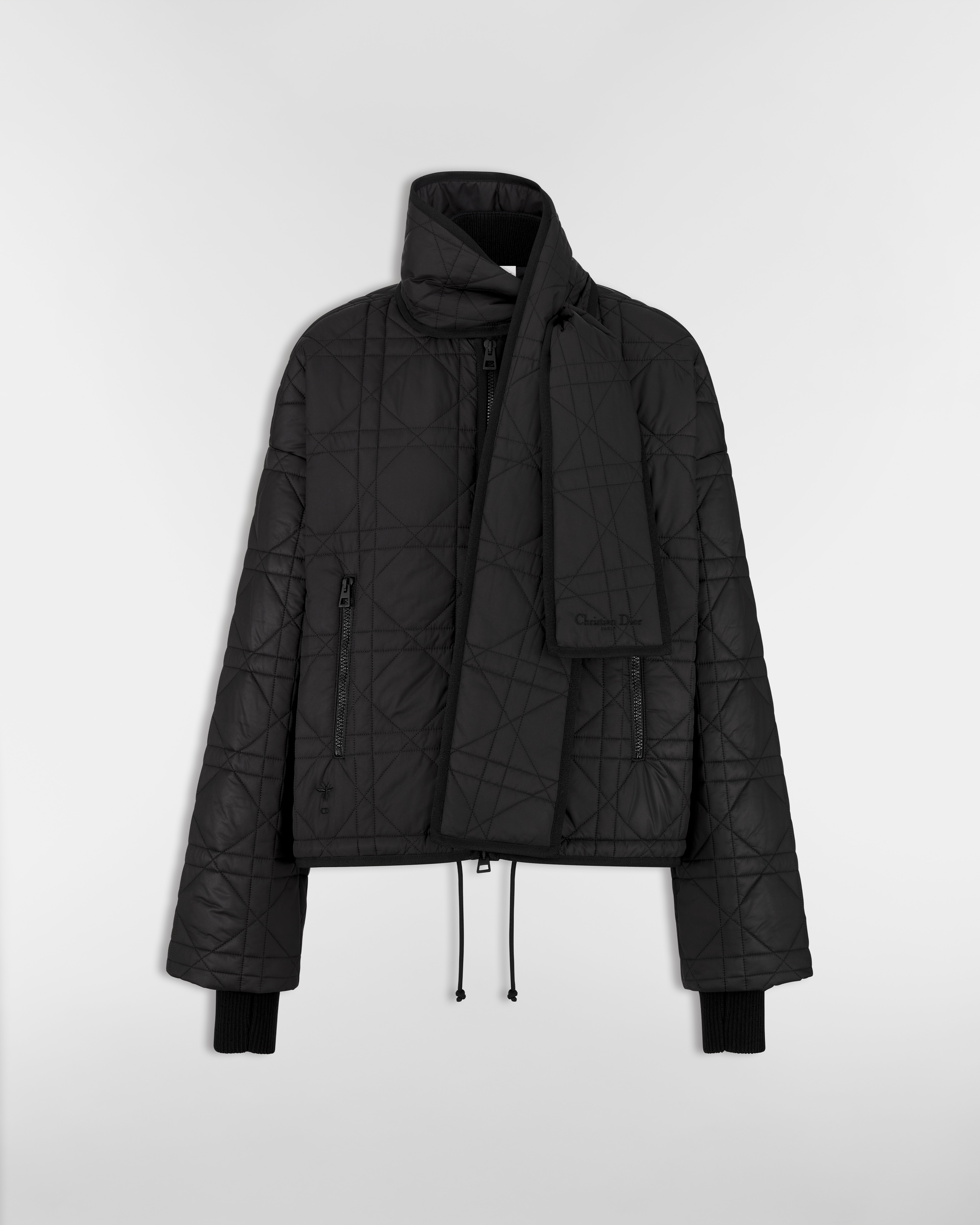 黑色绗缝塔夫绸科技面料超大藤格纹搭配围巾式衣领