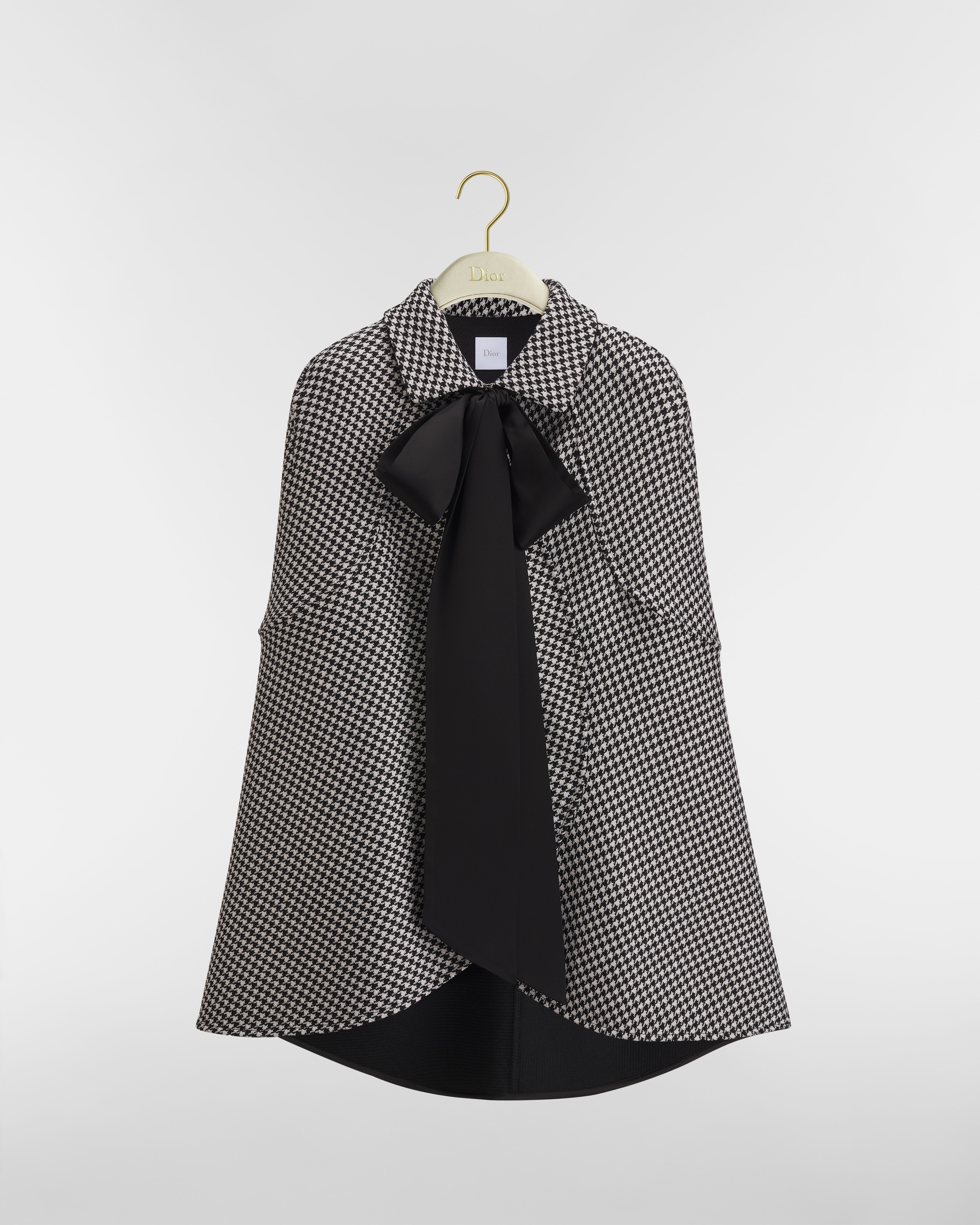 这款斗篷全新演绎 Dior 的优雅气质与摩登风范。采用黑色和白色绵羊毛混纺面料精心制作,饰以千鸟格纹。喇叭形廓形,搭配可拆卸黑色缎面衣领,饰以银色饰面金属 CD 标志和链条提升格调。可打造高雅的造型。