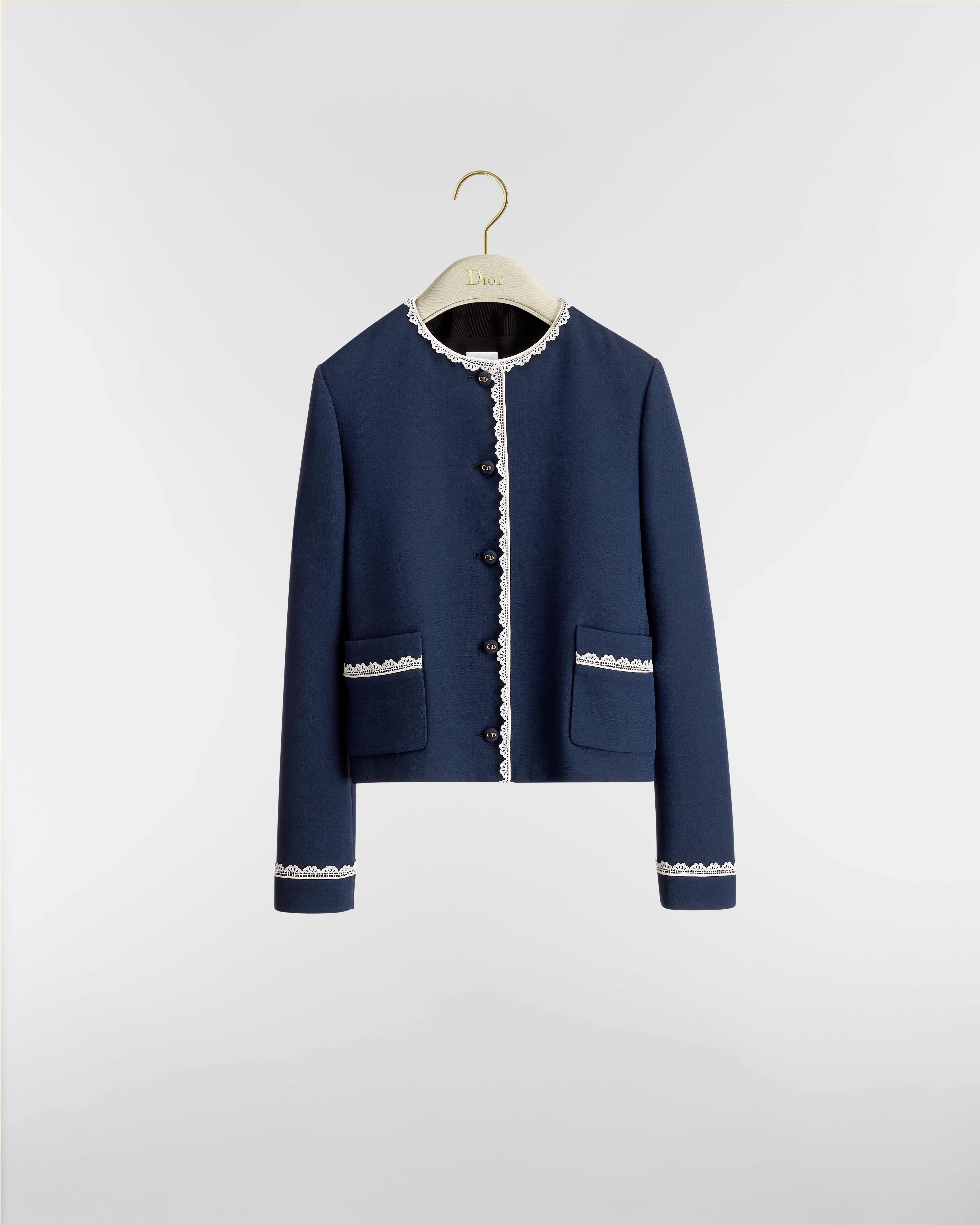 海军蓝色绵羊毛混纺面料搭配米白色蕾丝
