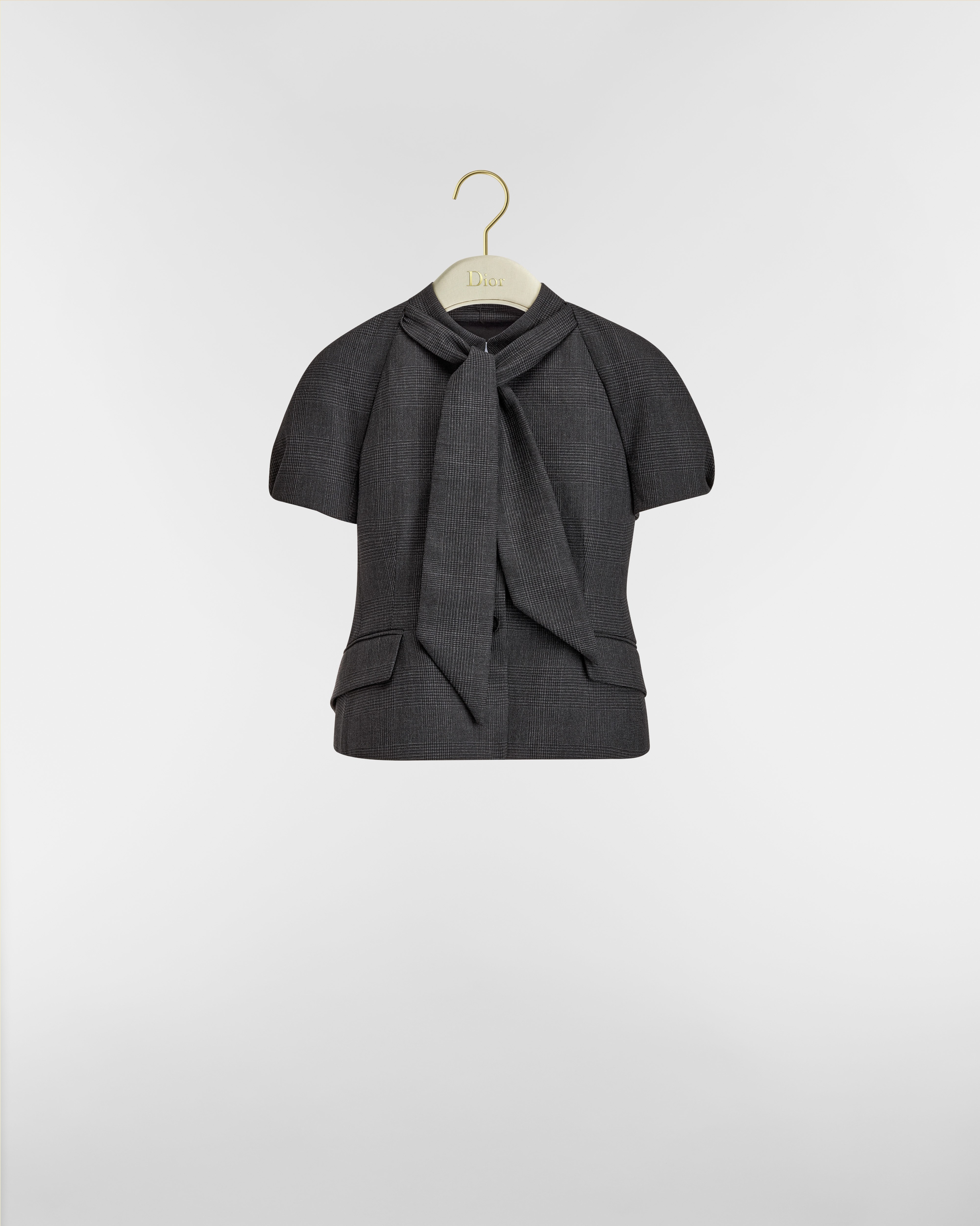 灰色绵羊毛混纺面料威尔士亲王格纹搭配系带式衣领