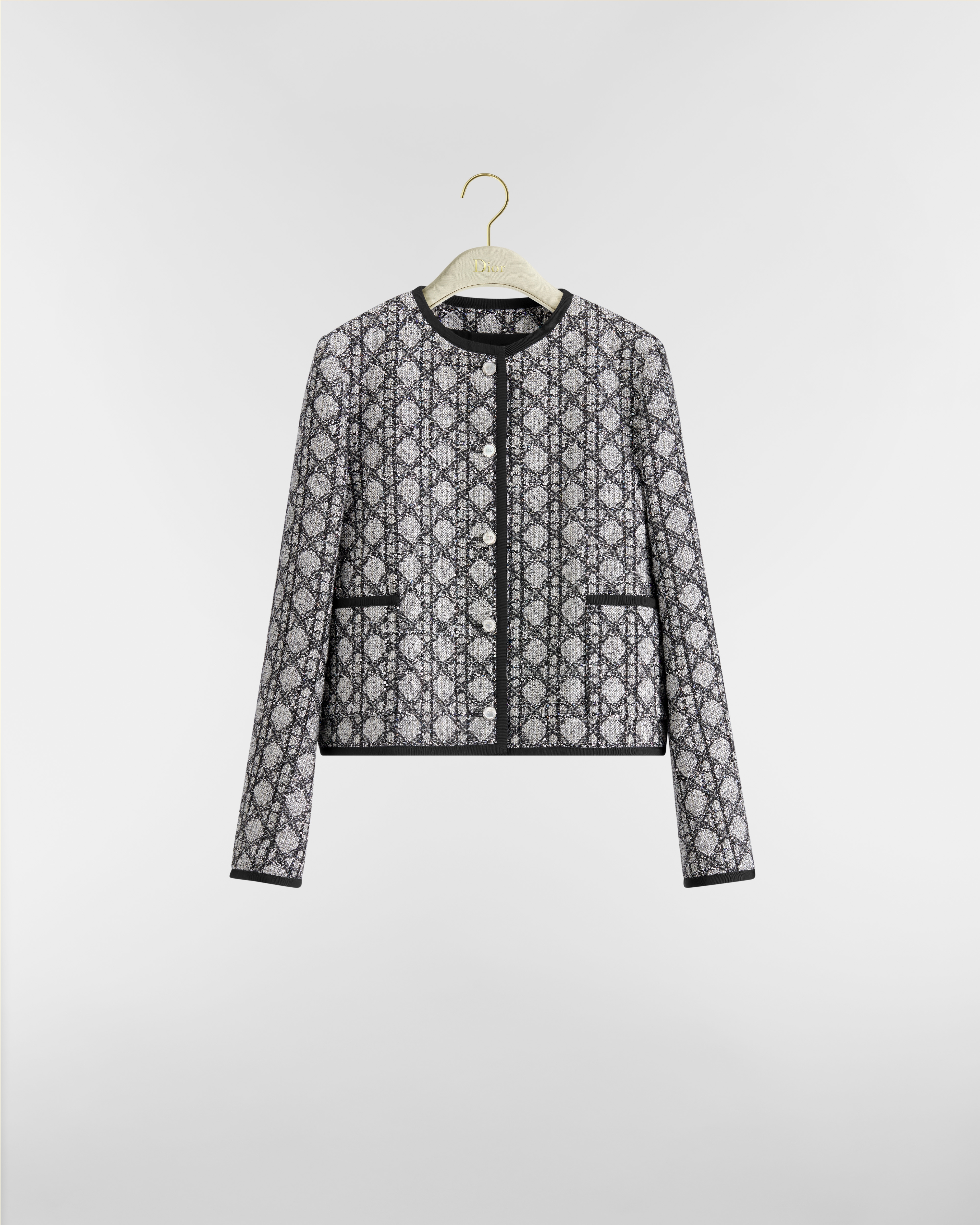黑色和白色粗花呢面料超大藤格纹搭配多色亮片刺绣