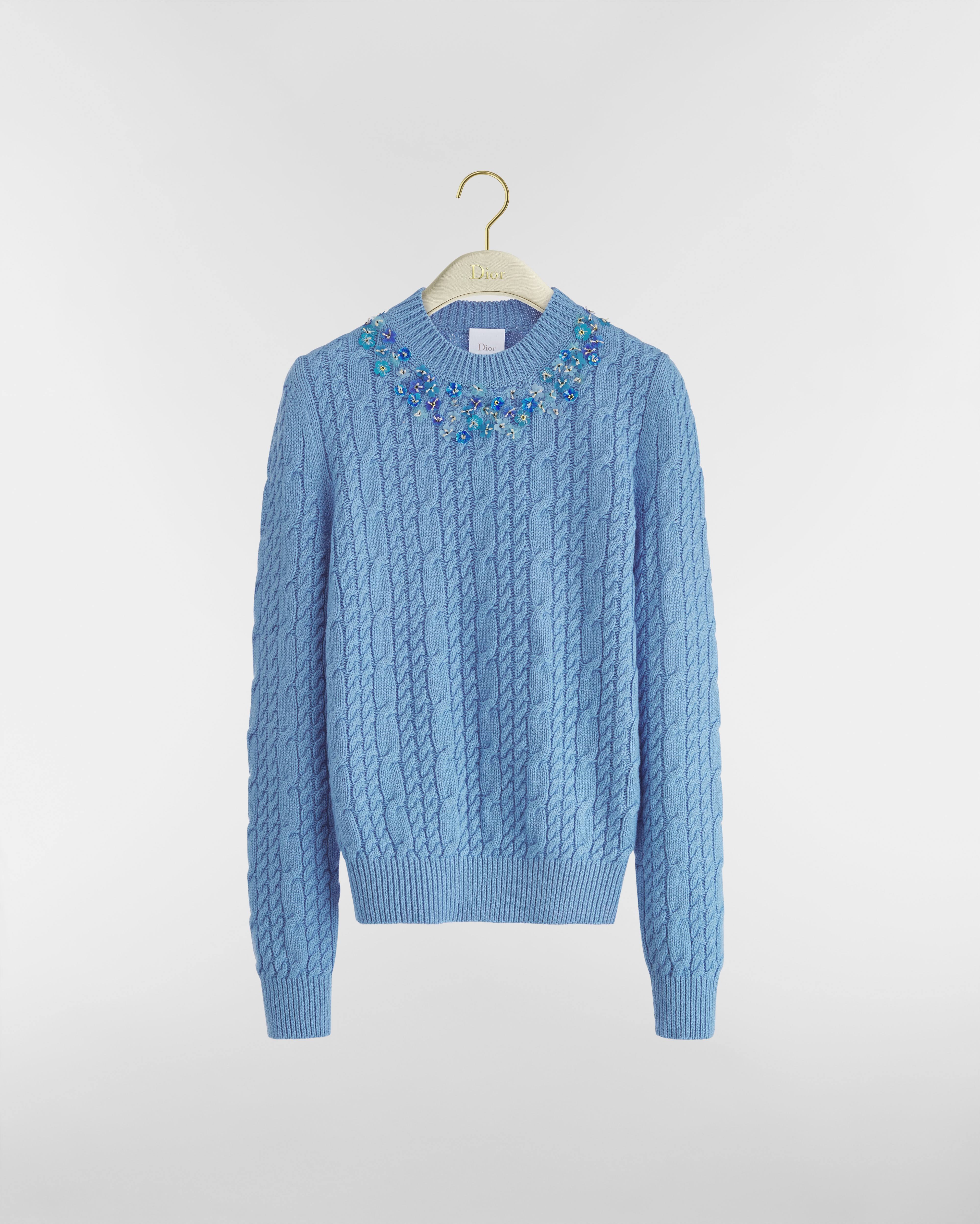 蓝色山羊绒绞花针织面料搭配立体花朵刺绣