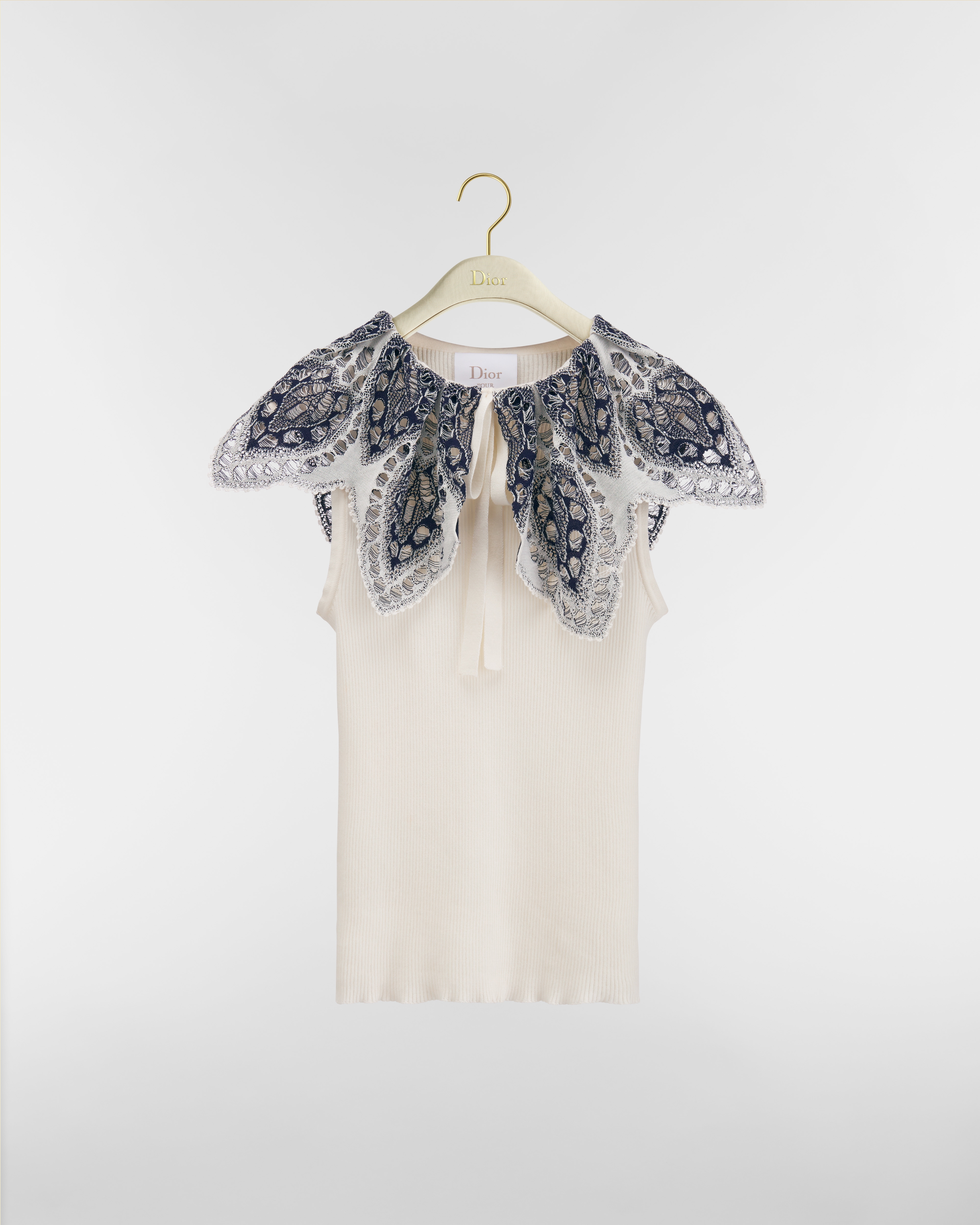 白色针织面料和海军蓝色和白色棉质混纺蕾丝荷叶边衣领