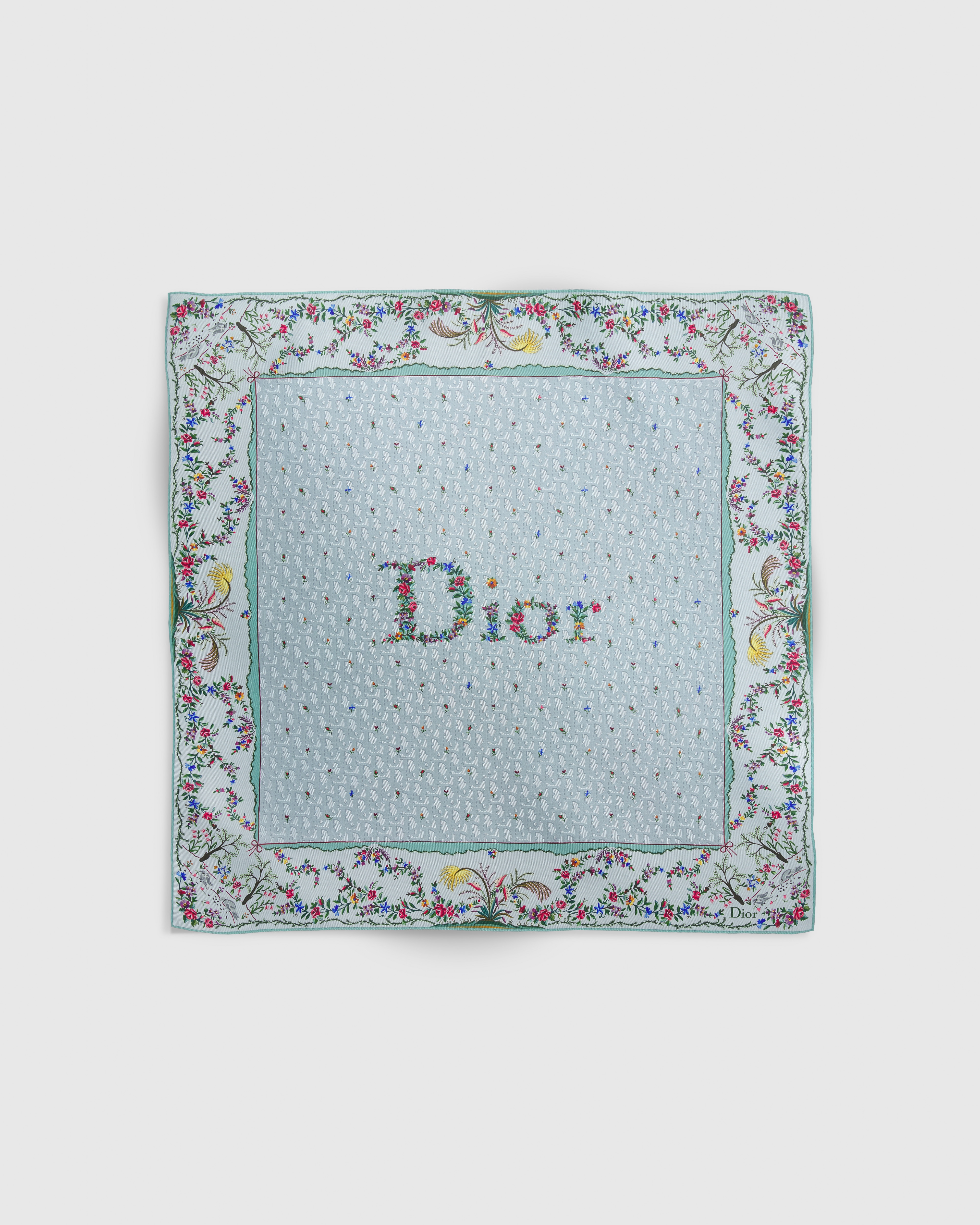 Revolution Flowers 是 Dioramour 限定系列的主要图案,从 18 世纪的刺绣汲取灵感,通过乔纳森·安德森 (Jonathan Anderson) 的现代视角重新演绎,以精致缤纷的花卉生动呈现 Dior 标志,向法国刺绣和精裁传统的历史致敬。采用蓝色桑蚕丝斜纹面料精心制作,饰以多色图案和手工卷边,点缀以同色调 Oblique 印花和 Dior 标志提升格调。可系在颈部或作为头巾使用,打造时尚的经典造型。可与其他 Dioramour 限定系列单品轻松搭配,打造配套造型。