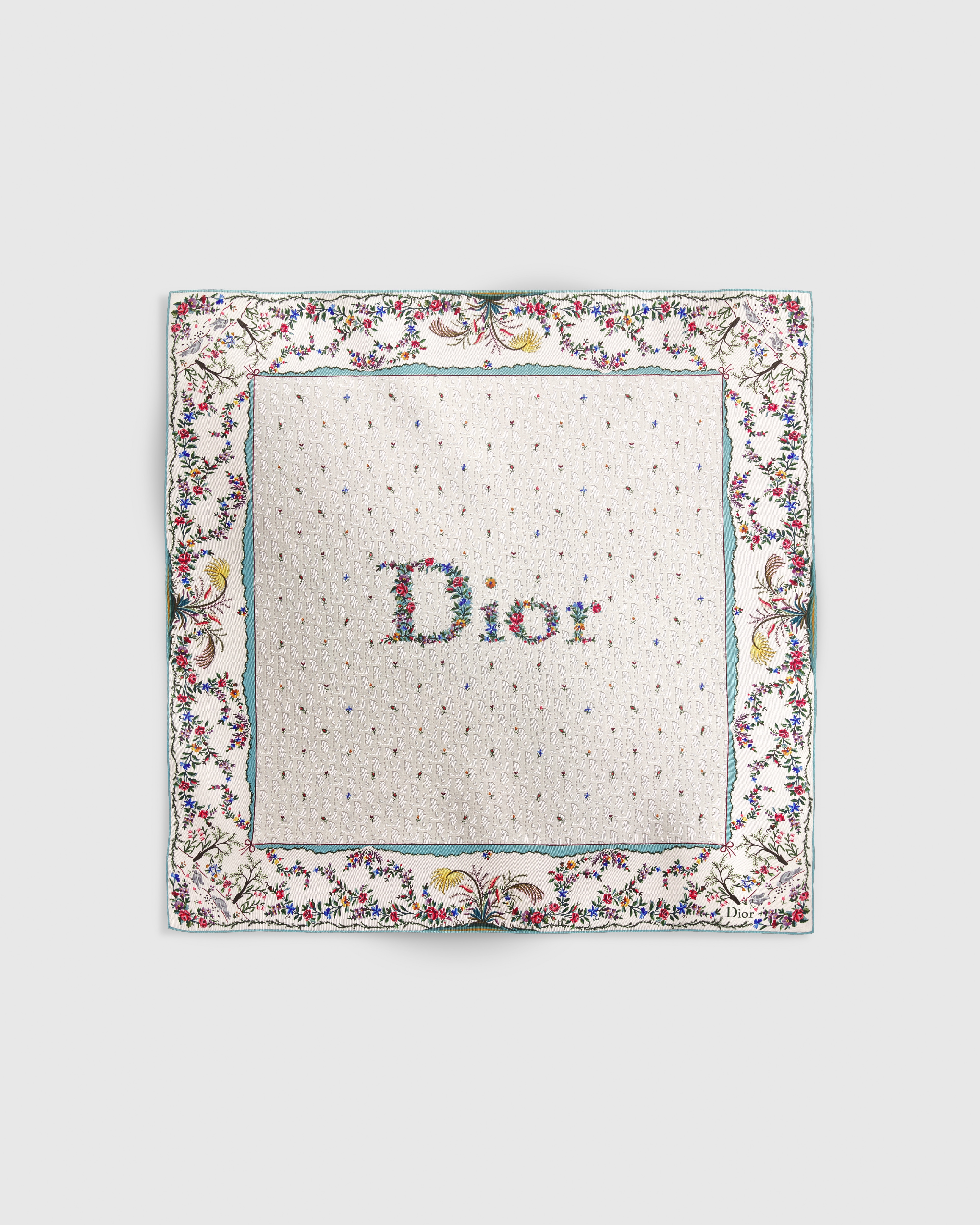 Revolution Flowers 是 Dioramour 限定系列的主要图案,从 18 世纪的刺绣汲取灵感,通过乔纳森·安德森 (Jonathan Anderson) 的现代视角重新演绎,以精致缤纷的花卉生动呈现 Dior 标志,向法国刺绣和精裁传统的历史致敬。采用白色桑蚕丝斜纹面料精心制作,饰以多色图案和手工卷边,点缀以同色调 Oblique 印花和 Dior 标志提升格调。可系在颈部或作为头巾使用,打造时尚的经典造型。可与其他 Dioramour 限定系列单品轻松搭配,打造配套造型。