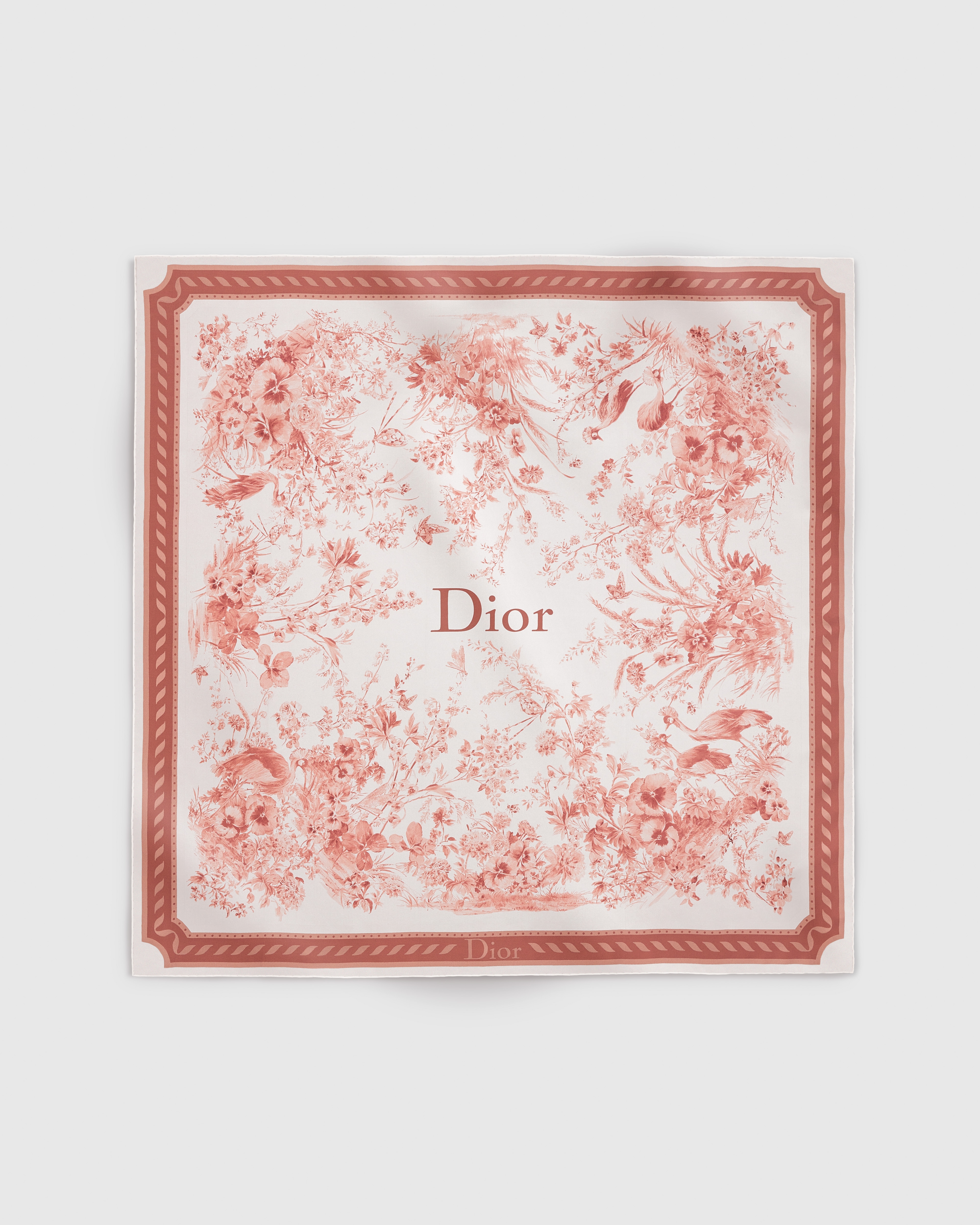 这款方巾饰以 Floral Garden 茹伊印花,灵感源自 18 世纪的装饰艺术,以诗意风格致敬花朵与大自然。采用米白色和粉色桑蚕丝斜纹面料精心制作,双面设计,手工卷边,中间饰以 Dior 标志提升格调,搭配点缀以 Dior 标志的对比鲜明的提花条形图案。可系在颈部或作为头巾使用,打造摩登造型。