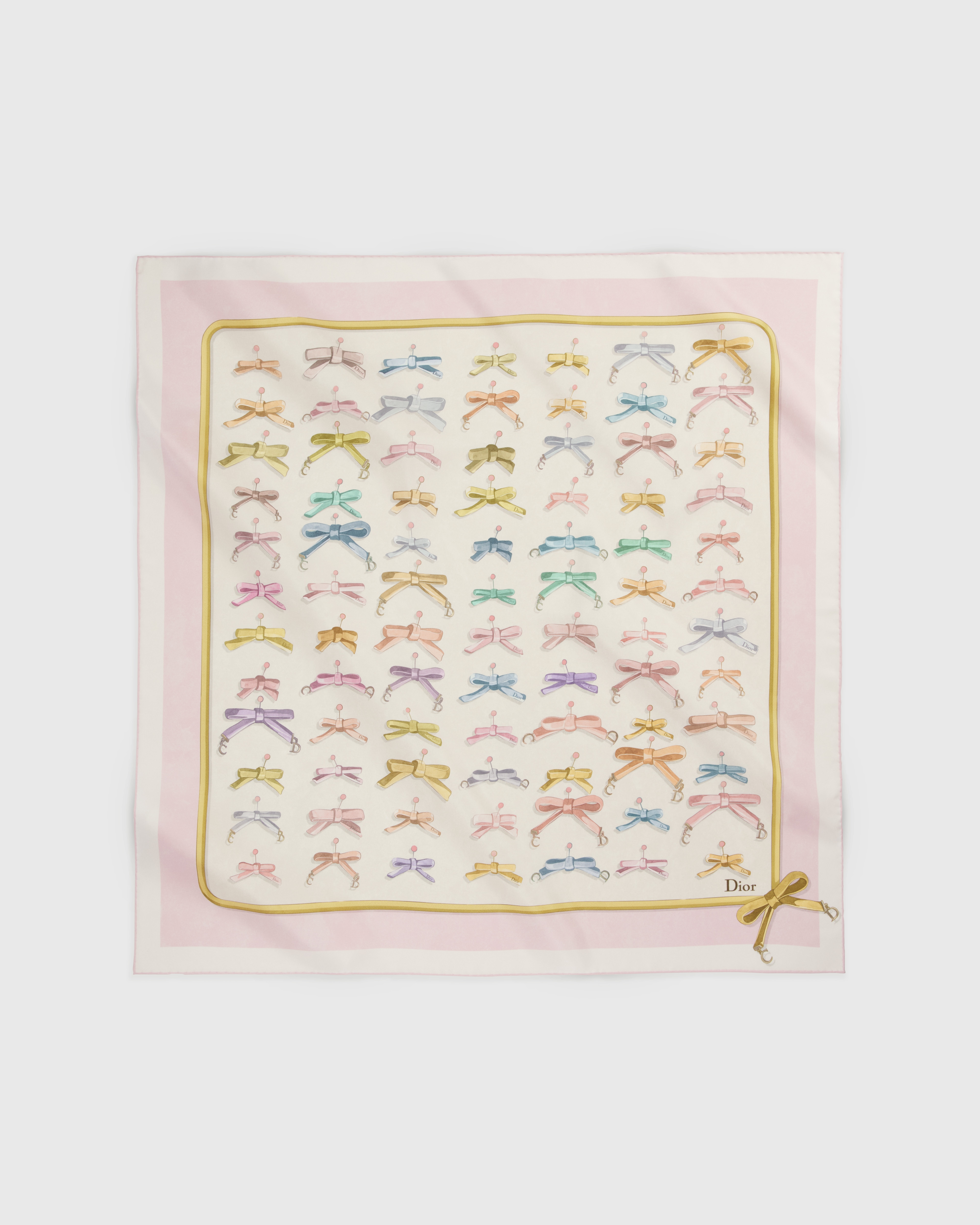 这款方巾饰以 Delicate Bow 图案印花,向乔纳森·安德森 (Jonathan Anderson) 设计的全新旗舰 Dior 经典标识致敬,彰显柔和、诗意的美学风格。采用粉色桑蚕丝斜纹面料精心制作,饰以多色图案,搭配对比鲜明的手工卷边,点缀以 Dior 标志,蝴蝶结两端点缀以 CD 标志,提升格调。可系在颈部或作为头巾使用,打造时尚的经典造型。