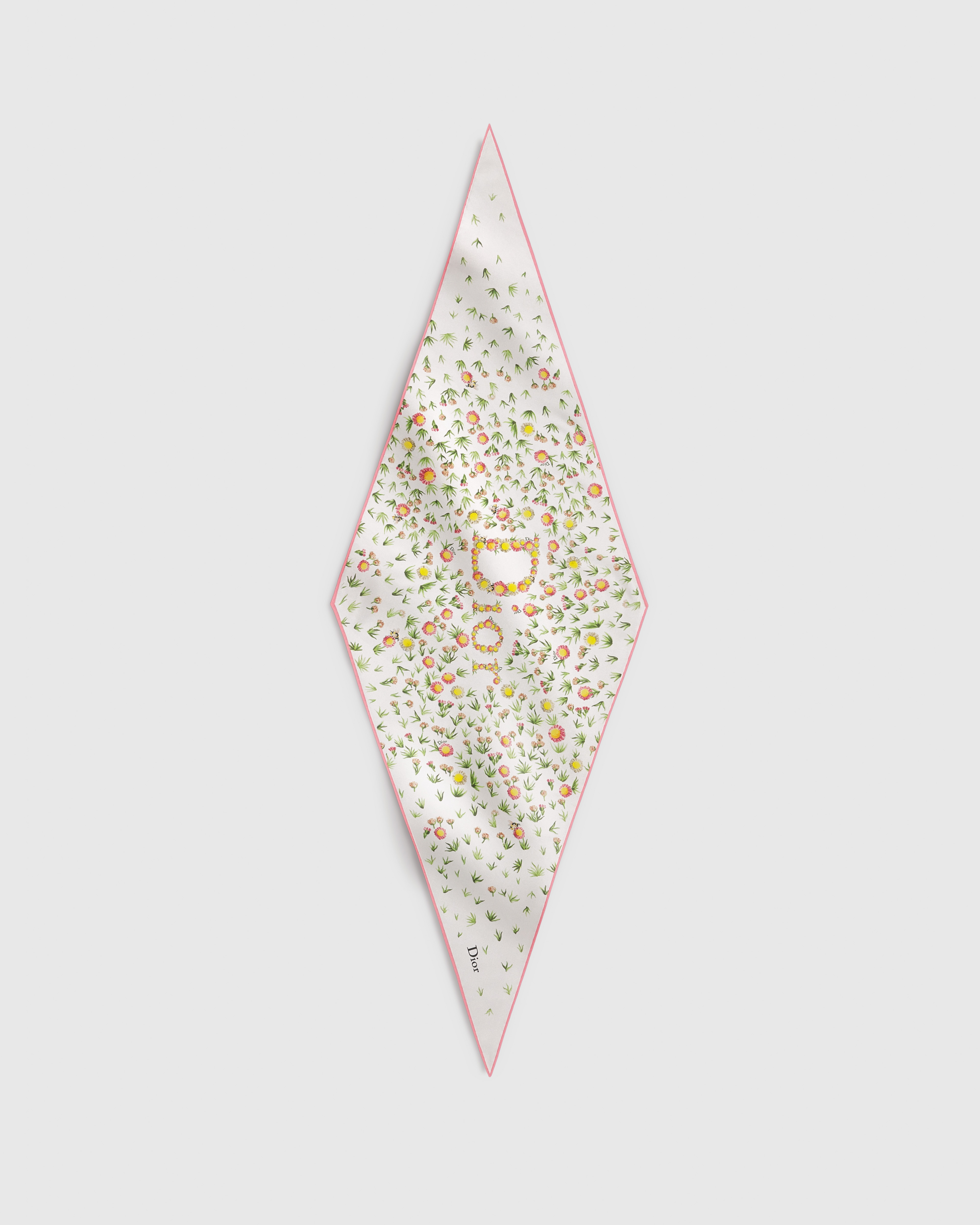 这款 Dior Diamond 丝巾饰以 Daisy Garden 图案印花,在充满田园风情、色彩缤纷的场景中彰显雏菊的风采,致敬 Dior 钟情于花卉的传承。采用米白色桑蚕丝斜纹面料精心制作,饰以多色图案,搭配对比鲜明的手工卷边,点缀以花卉 Dior 标志提升格调。时尚百搭,可系在头部、颈部或手腕,亦可系在手袋或作为腰带使用,打造时尚优雅的造型。