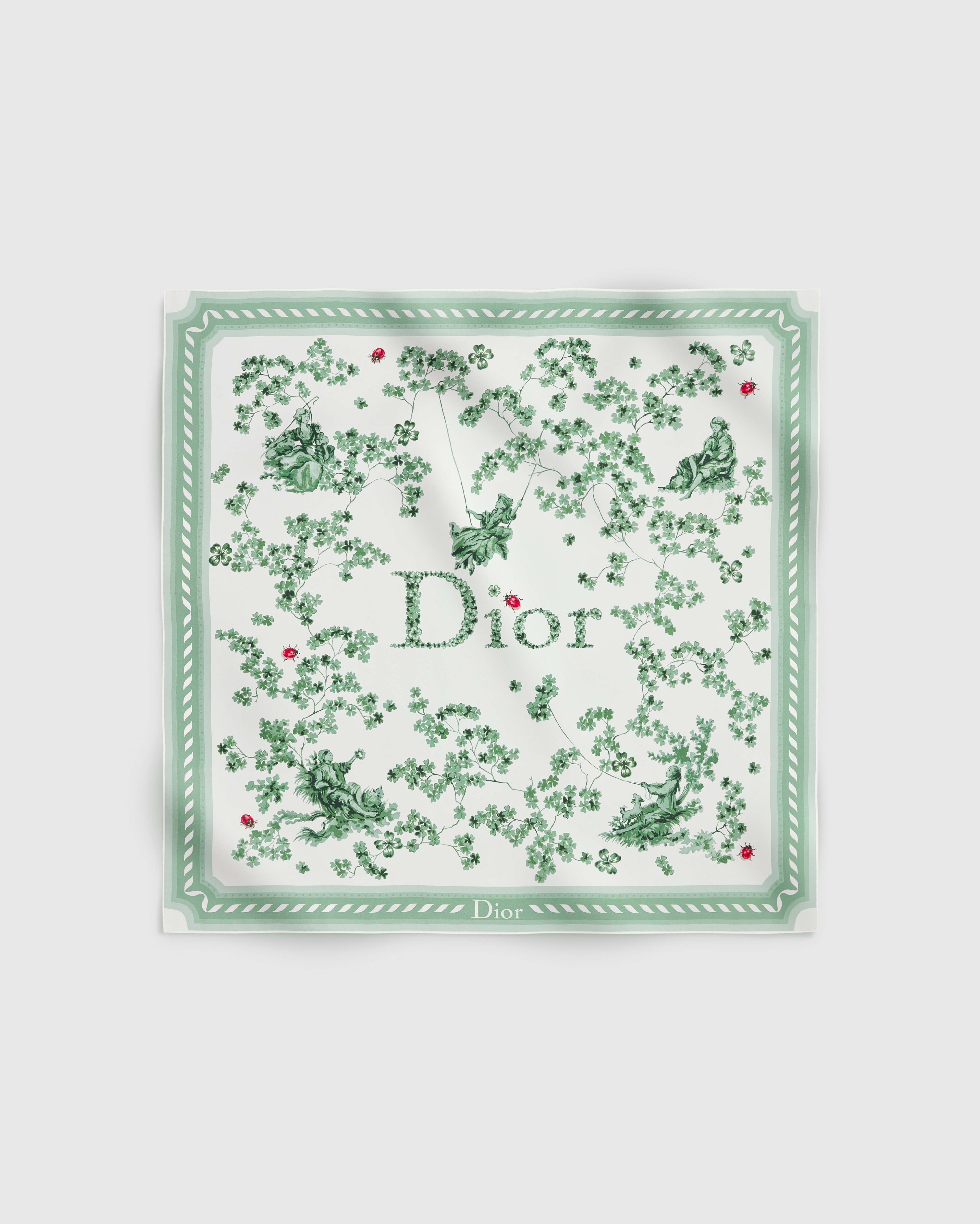 这款四叶草茹伊印花图案方巾彰显从 18 世纪汲取灵感的图案,饰以四叶草和瓢虫,打造清新和飘逸的美感。采用白色底色绿色图案桑蚕丝斜纹面料精心制作,双面设计,搭配手工卷边,点缀以 Christian Dior 标志提花条形图案提升格调。可系在颈部或作为头巾使用,打造 Dior 经典造型。
