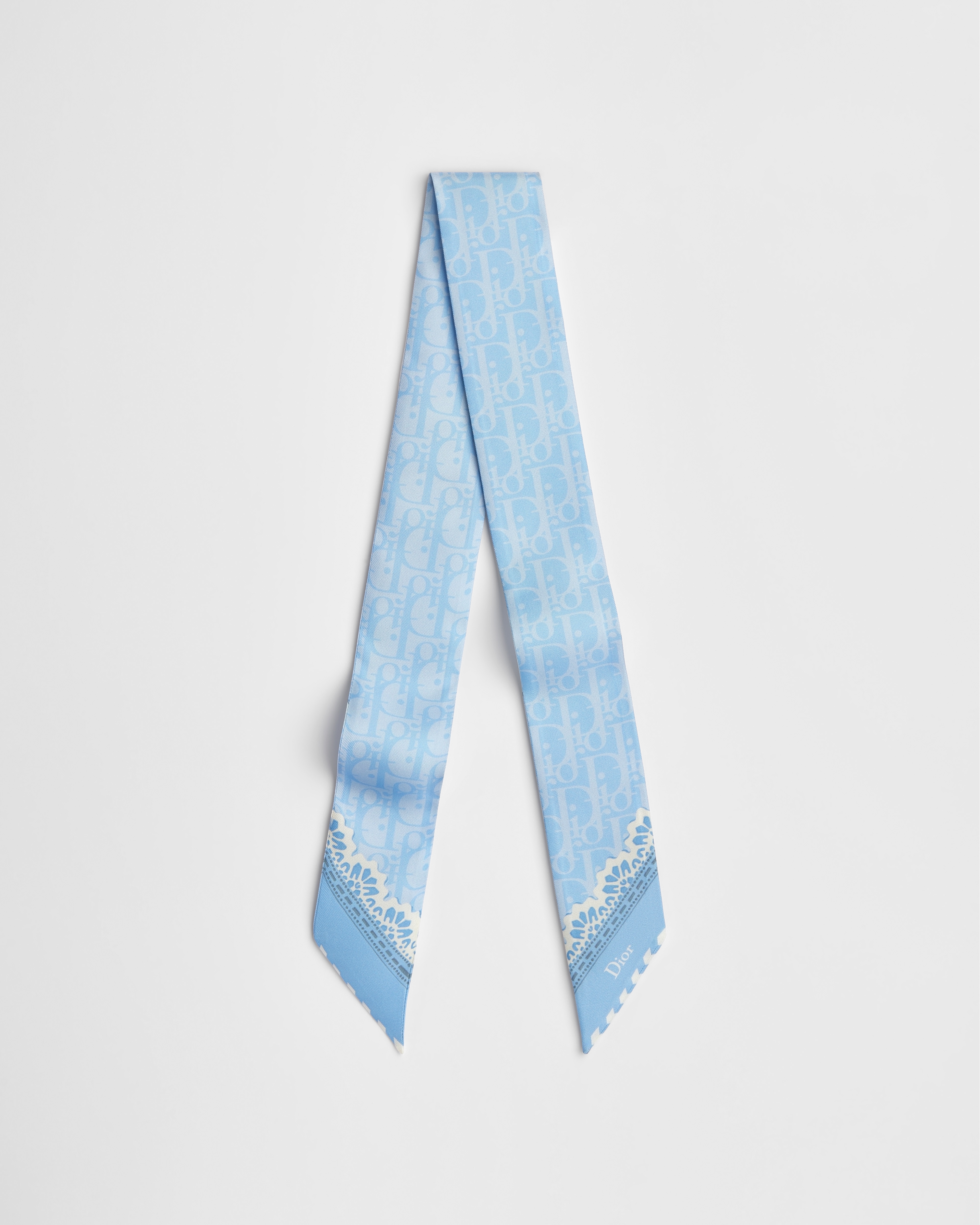 这款 Mitzah 丝巾饰以 Dior Médaillon 标志,重新诠释 Oblique 印花,以现代视角再现 18 世纪的华丽风格。款式经典,采用淡蓝色桑蚕丝斜纹面料精心制作,造型修长,两端尖角设计,点缀以 Dior 标志。可系在颈部、手腕或手袋上,为各式时尚造型增添点睛之笔。