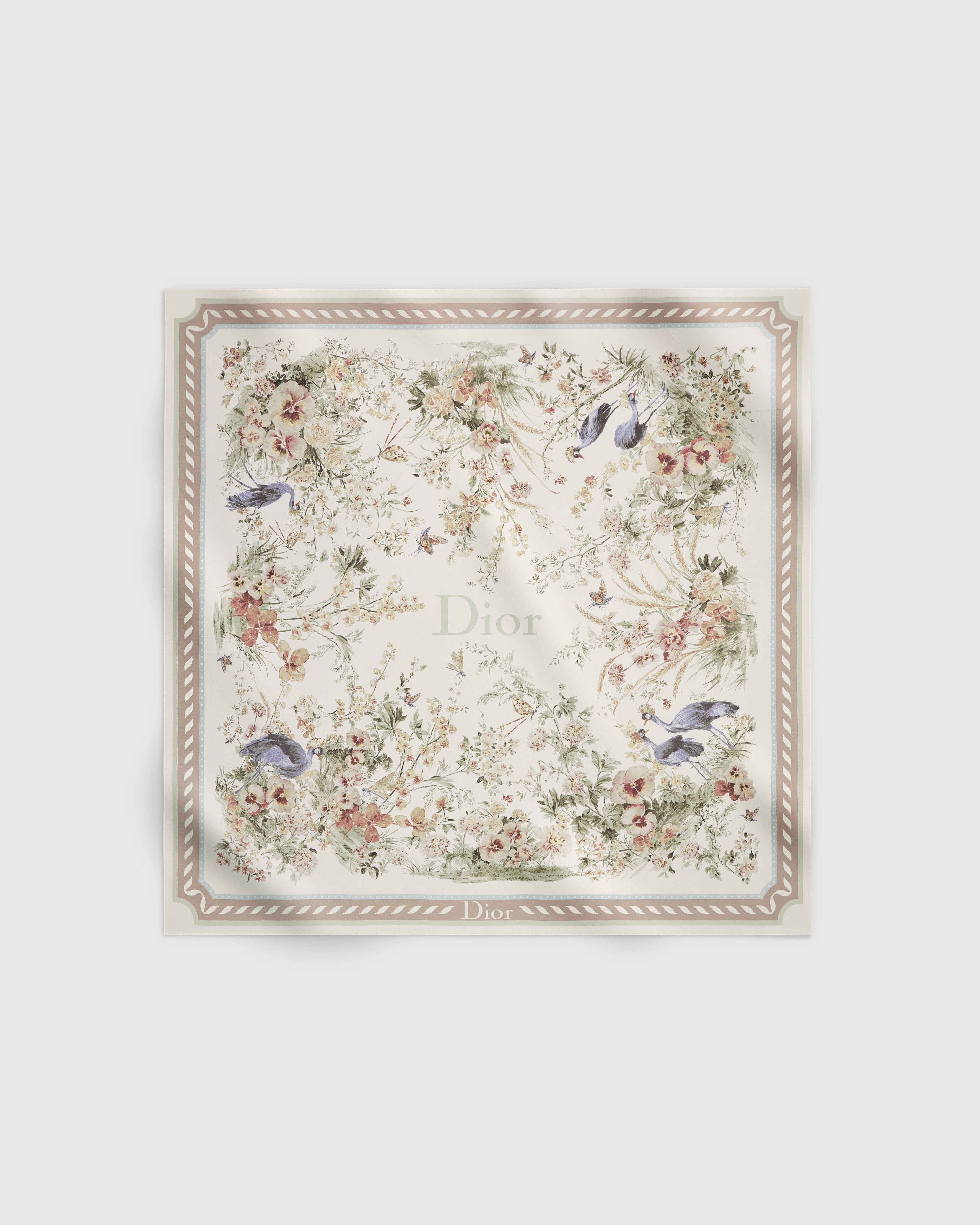 这款方巾来自 Dioriviera 限定系列,饰以 Floral Garden 茹伊印花,采用优雅缤纷的花卉印花重新诠释 Dior 经典图案。采用象牙色桑蚕丝斜纹面料精心制作,饰以多色图案,双面设计搭配手工卷边,饰以对比鲜明的 Dior 标志提花条形图案。可系在颈部或头上,也可与该系列的其他单品搭配。