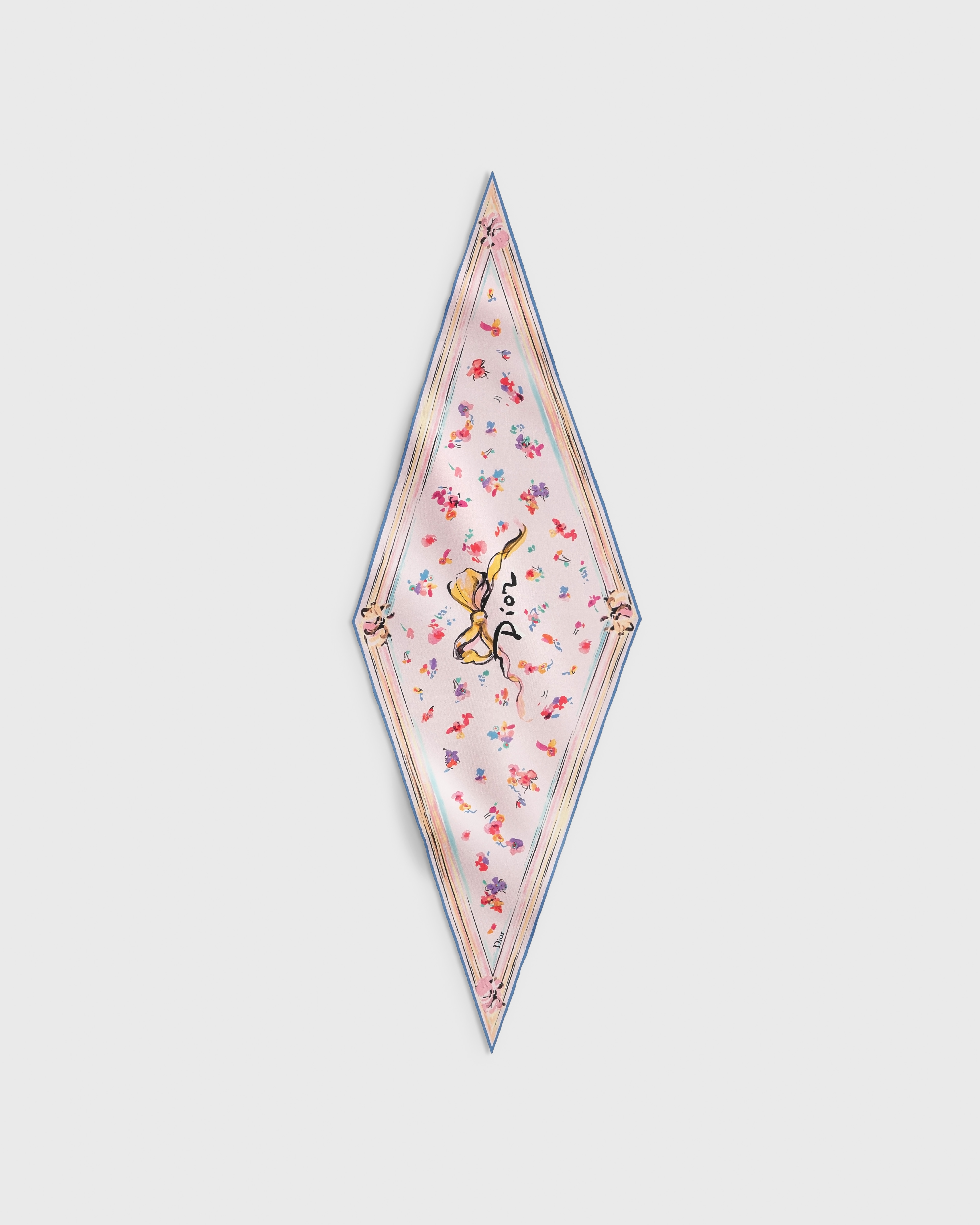 这款 Dior Diamond 丝巾来自 Dioriviera 限定系列,饰以 Dior Floral Portrait 图案,重新诠释 Dior 标志和经典蝴蝶结,优雅的设计彰显艺术家克里斯汀·贝拉尔 (Christian Bérard) 作品*的精神。采用粉色桑蚕丝斜纹面料精心制作,饰以多色图案,搭配对比鲜明的手工卷边,点缀以 Dior 标志。时尚百搭,可系在头部、颈部或手腕,也可系在手袋或作为腰带使用,打造时尚高雅的造型。