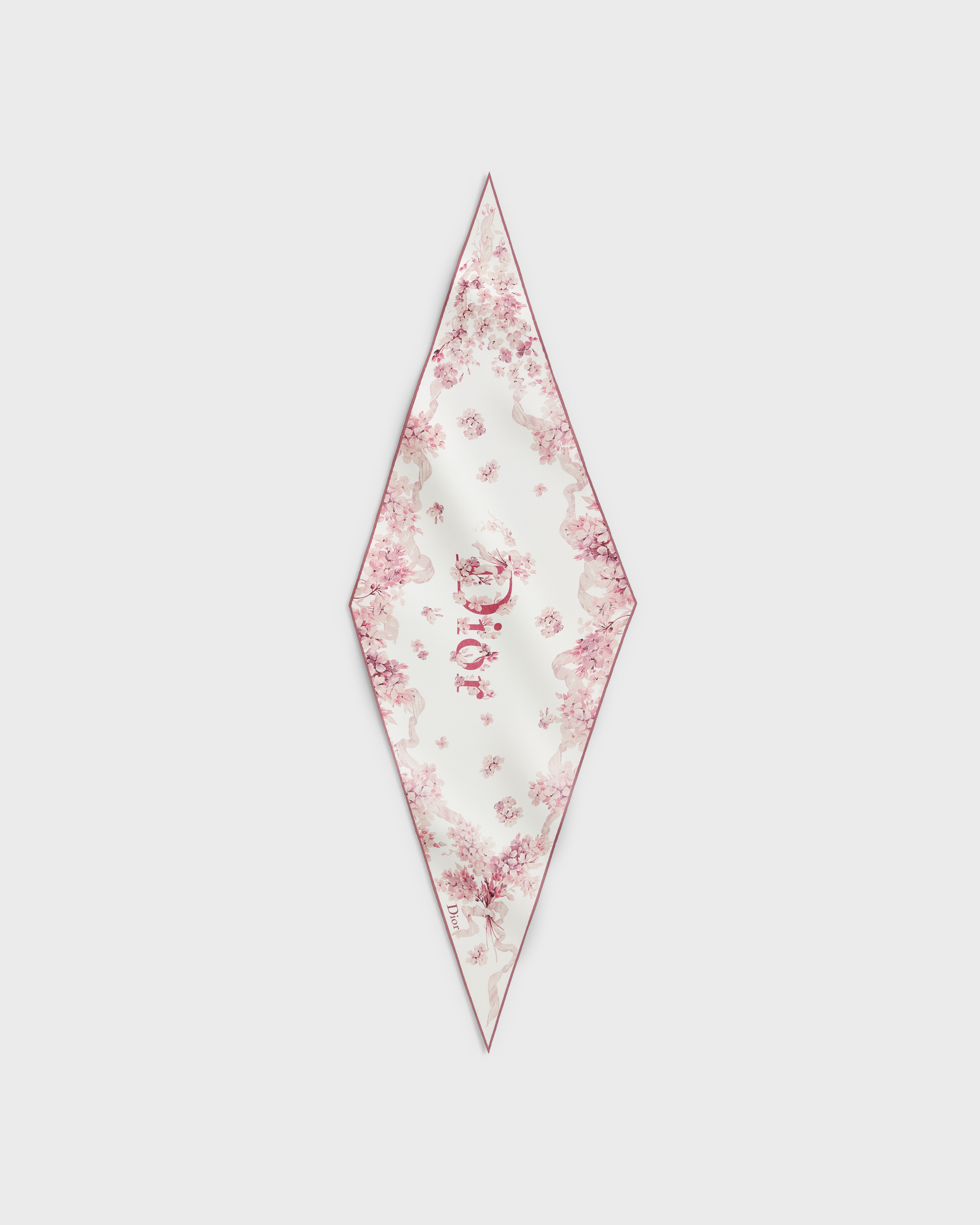 这款 Dior Diamond 丝巾饰以 Dior Lilac Bouquet 图案,从丁香花的雅致汲取灵感,为该系列注入柔和浪漫的气质,表达本季的诗意情怀。采用象牙色桑蚕丝斜纹面料精心制作,饰以粉色图案,搭配对比鲜明的手工卷边,点缀以 Dior 标志。时尚百搭,可系在头部、颈部或手腕,也可系在手袋或作为腰带使用,打造时尚优雅的造型。