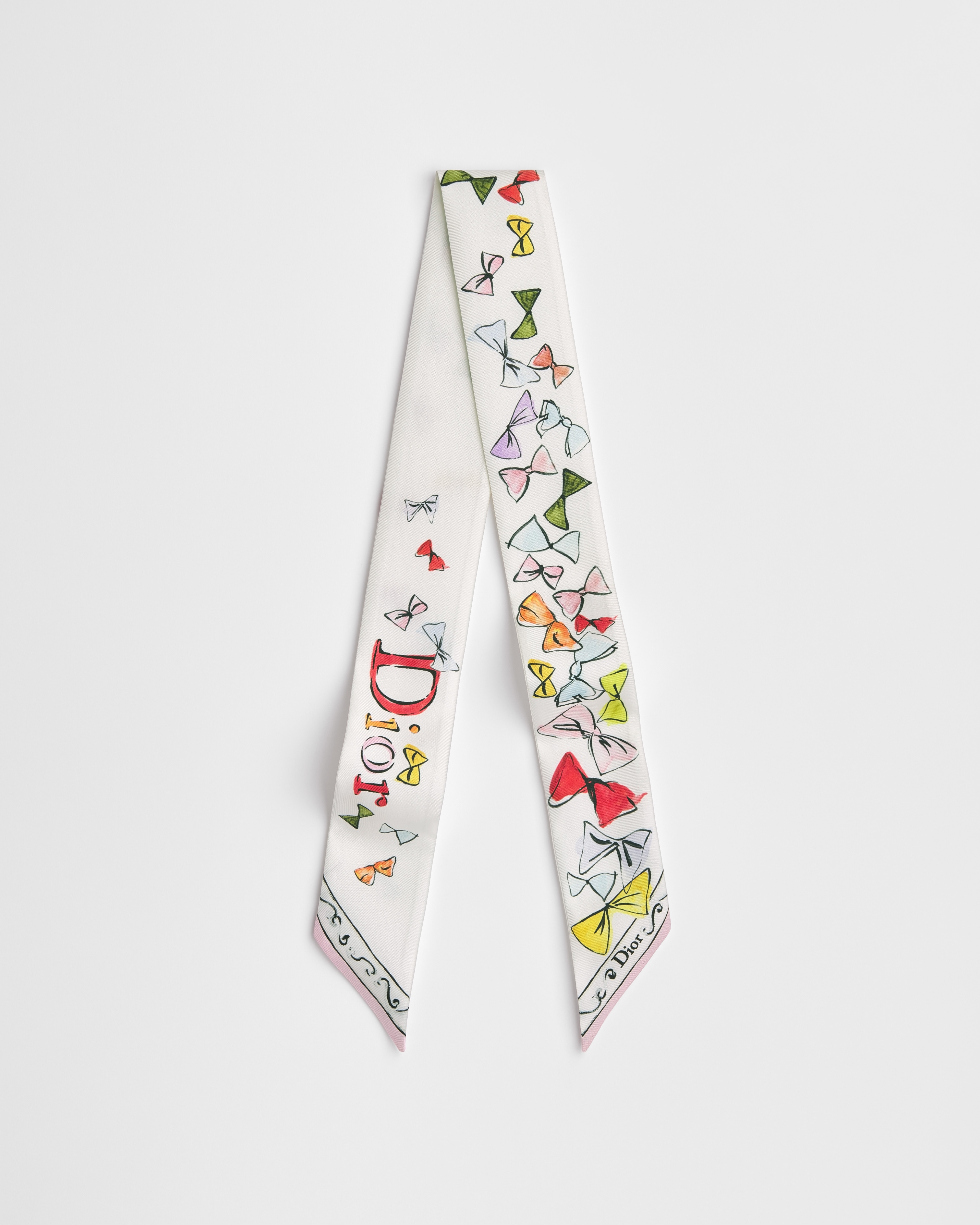 这款 Mitzah 丝巾来自 Dioriviera 限定系列,饰以 Dior Bows 图案,灵感源自艺术家克里斯汀·贝拉尔 (Christian Bérard) 的作品*,全新演绎乔纳森·安德森 (Jonathan Anderson) 的特色蝴蝶结。款式经典,采用白色桑蚕丝斜纹面料精心制作,饰以多色图案,造型修长,两端尖角设计,点缀以 Dior 标志。可系在颈部、手腕或手袋上,为各式时尚造型增添点睛之笔,也可与其他 Dior Bows 图案单品搭配。