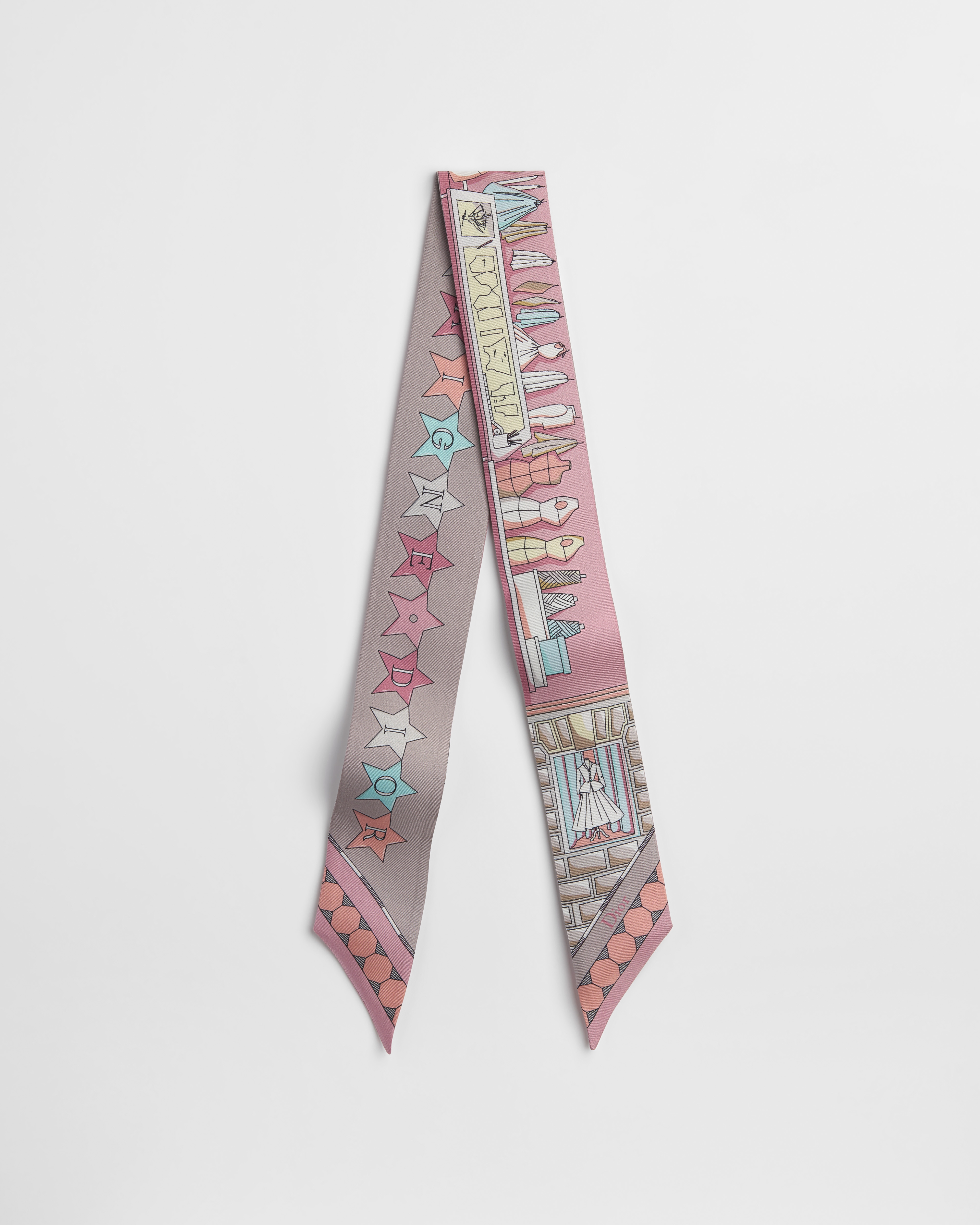 这款 Mitzah 丝巾采用粉色调多色桑蚕丝斜纹面料精心制作,饰以 Inside Dior Avenue 图案,全新演绎蒙田大道三十号富有传奇色彩的地址,通过一系列经典符号彰显 Dior 传承。款式经典,造型修长,两端尖角设计,饰以 Dior 和 30 Avenue Montaigne 标志。可系在颈部、手腕或手袋上,为各式时尚造型增添点睛之笔。