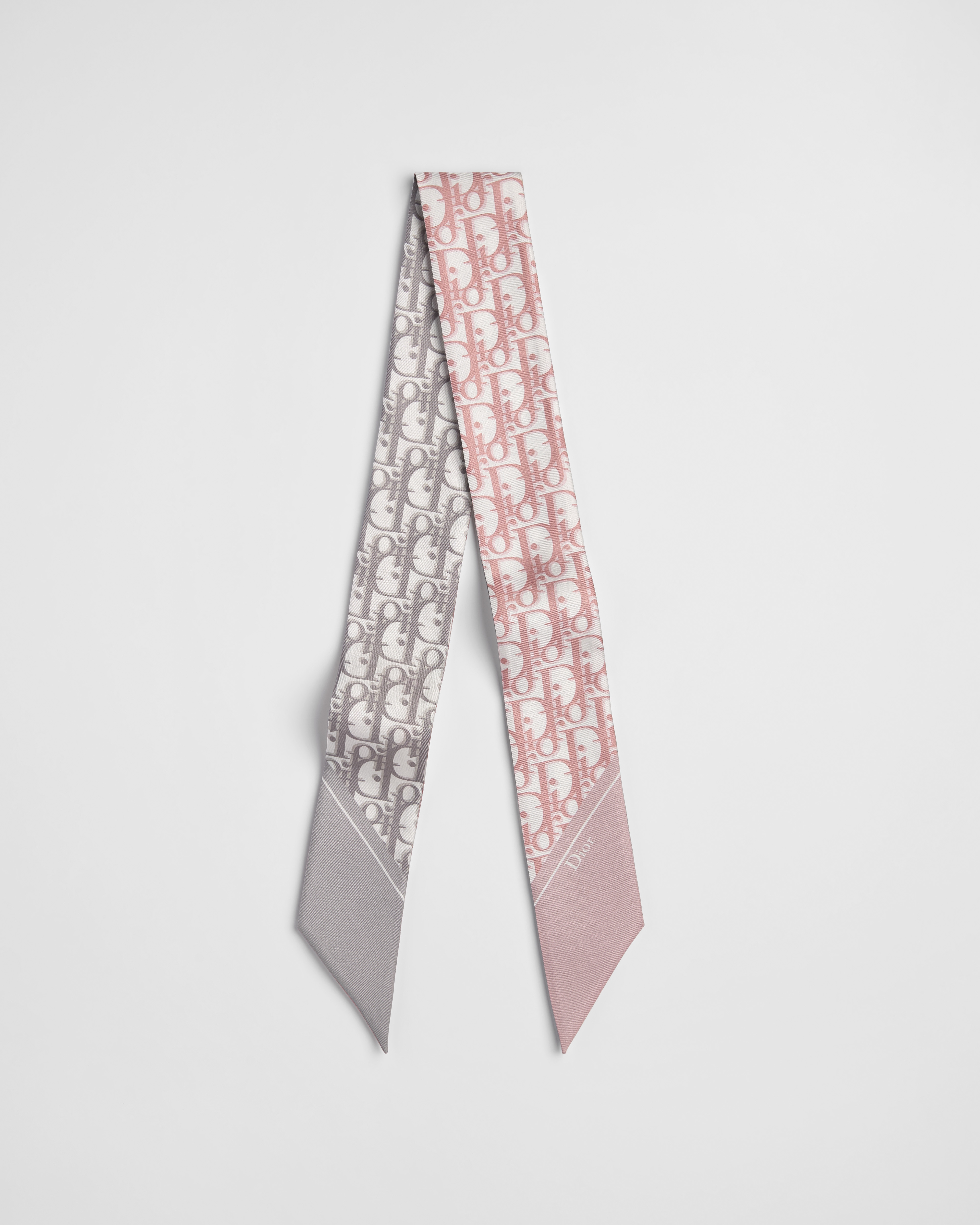 这款 Mitzah 丝巾采用桑蚕丝斜纹面料精心制作,饰以 Oblique 印花,以双色调全新演绎,回溯 Dior 于 1969 年推出的经典图案。款式经典,造型修长,两端尖角设计,一面为粉色,另一面为灰色,均饰以 Dior 标志。可系在颈部、手腕或手袋上,为各式时尚造型增添点睛之笔。