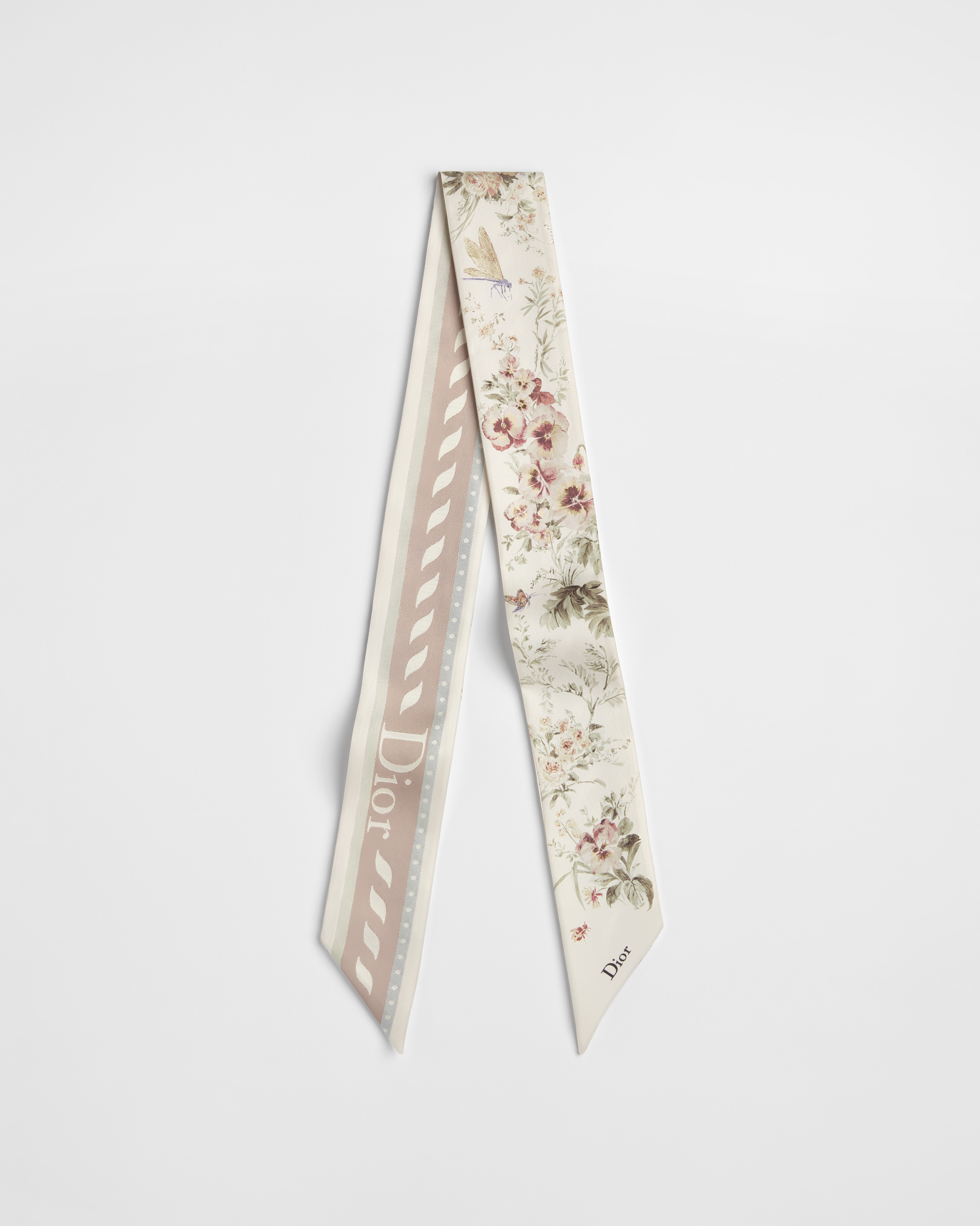 这款 Mitzah 丝巾来自 Dioriviera 限定系列,饰以 Floral Garden 茹伊印花,采用优雅缤纷的花卉印花重新诠释 Dior 经典图案。采用象牙色桑蚕丝斜纹面料精心制作,饰以多色图案,经典修长廓形,两端尖角设计,饰以对比鲜明的 Dior 标志提花条形图案。可系在颈部、手腕或手袋上,为各式时尚造型增添点睛之笔。