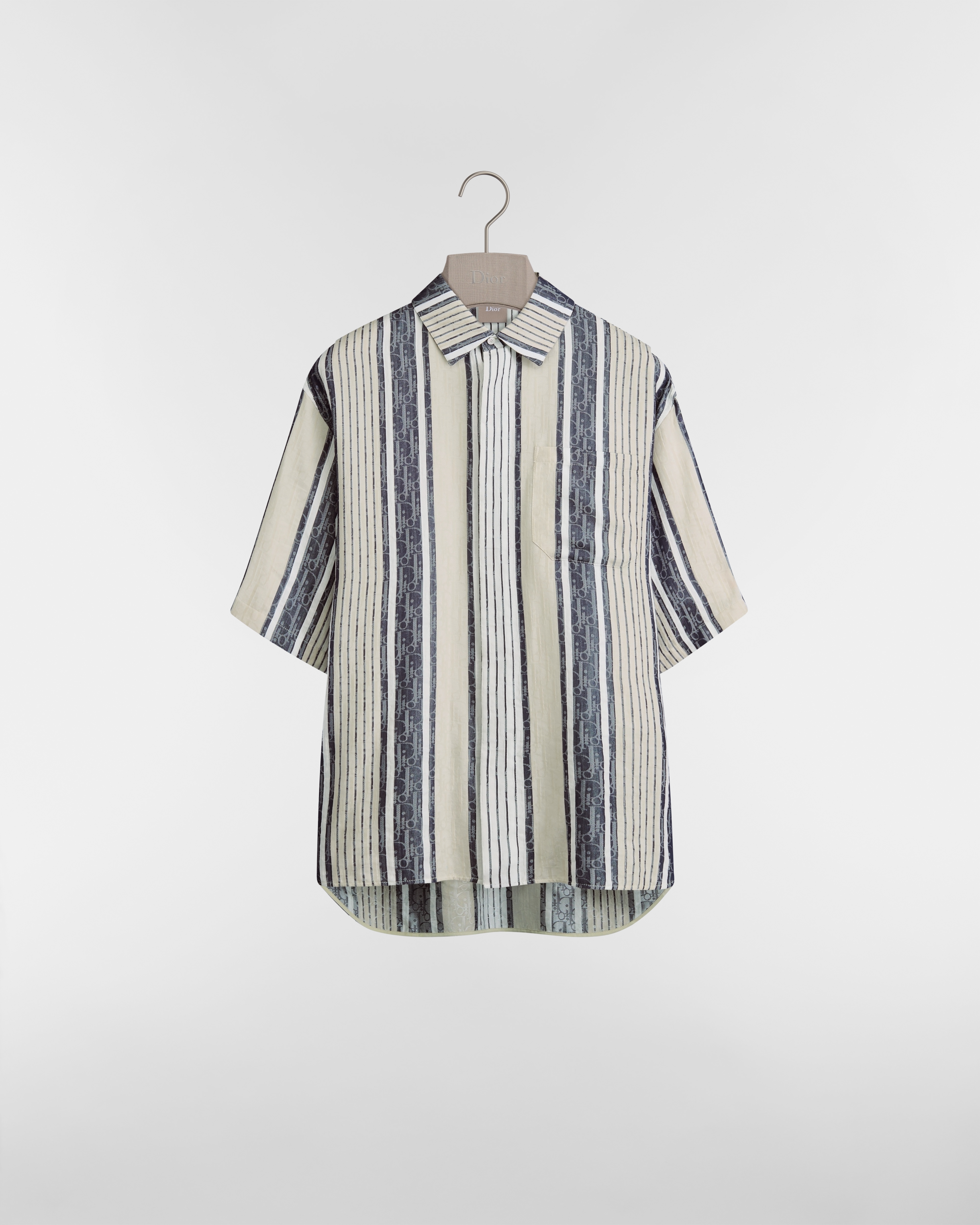 这款衬衫来自 Dioriviera 限定系列,饰以 Dior Oblique Sun Stripes 图案。该图案将 Dior 经典图案与交织组合的条纹相搭配,彰显 Dior 工坊非凡的精湛工艺,同时也体现乔纳森·安德森 (Jonathan Anderson) 的现代视角。采用蓝色条纹棉质和桑蚕丝混纺提花面料精心制作,经典版型搭配隐藏式纽扣门襟。可与该系列的短裤轻松搭配。
