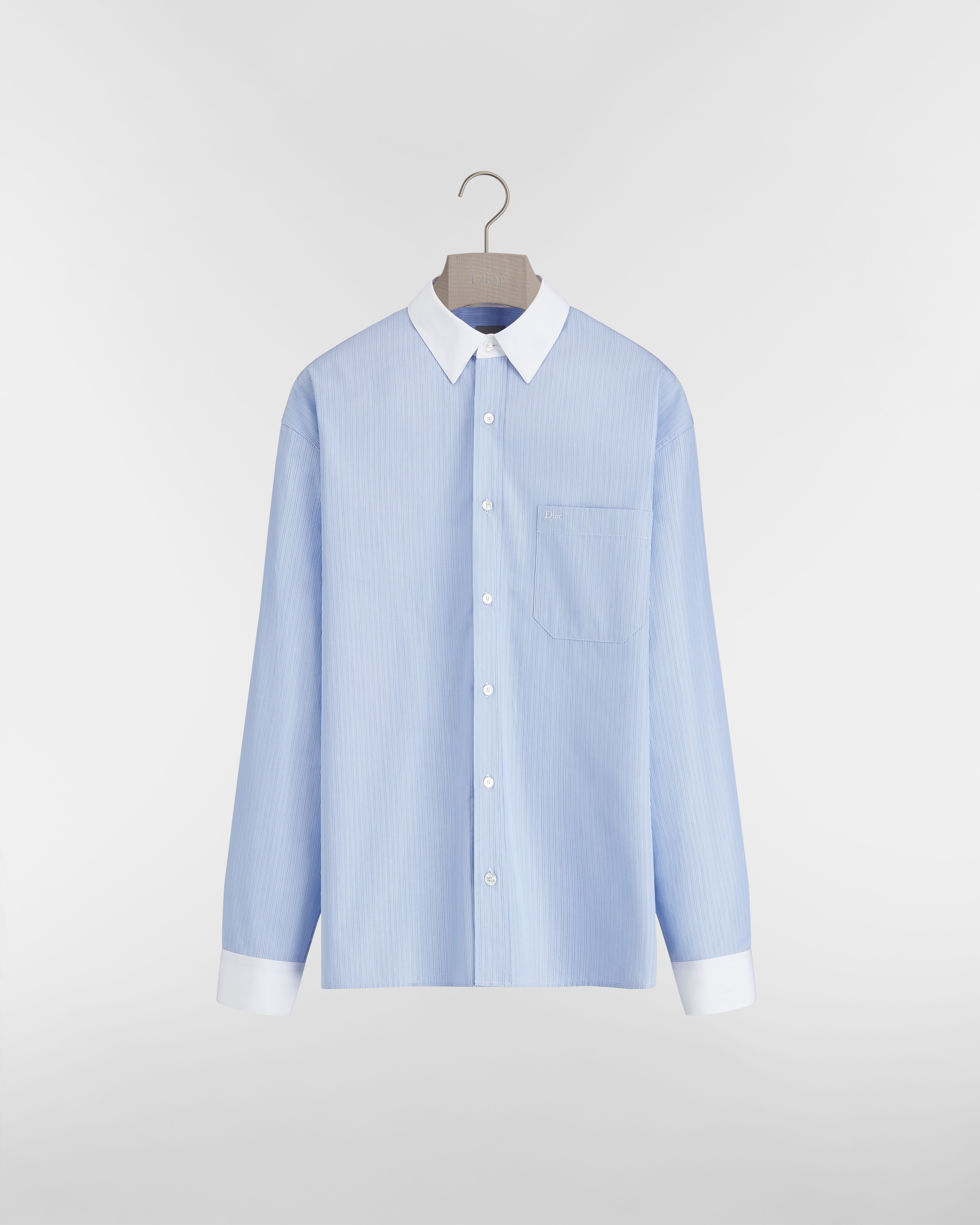 这款衬衫经过重新诠释,彰显时髦风范。采用蓝色条纹棉府绸面料精心制作,正面 Dior 刺绣搭配对比鲜明的衣领和袖口,饰以胸前贴袋更显精致。可为各式休闲造型彰显精致典雅的气质。