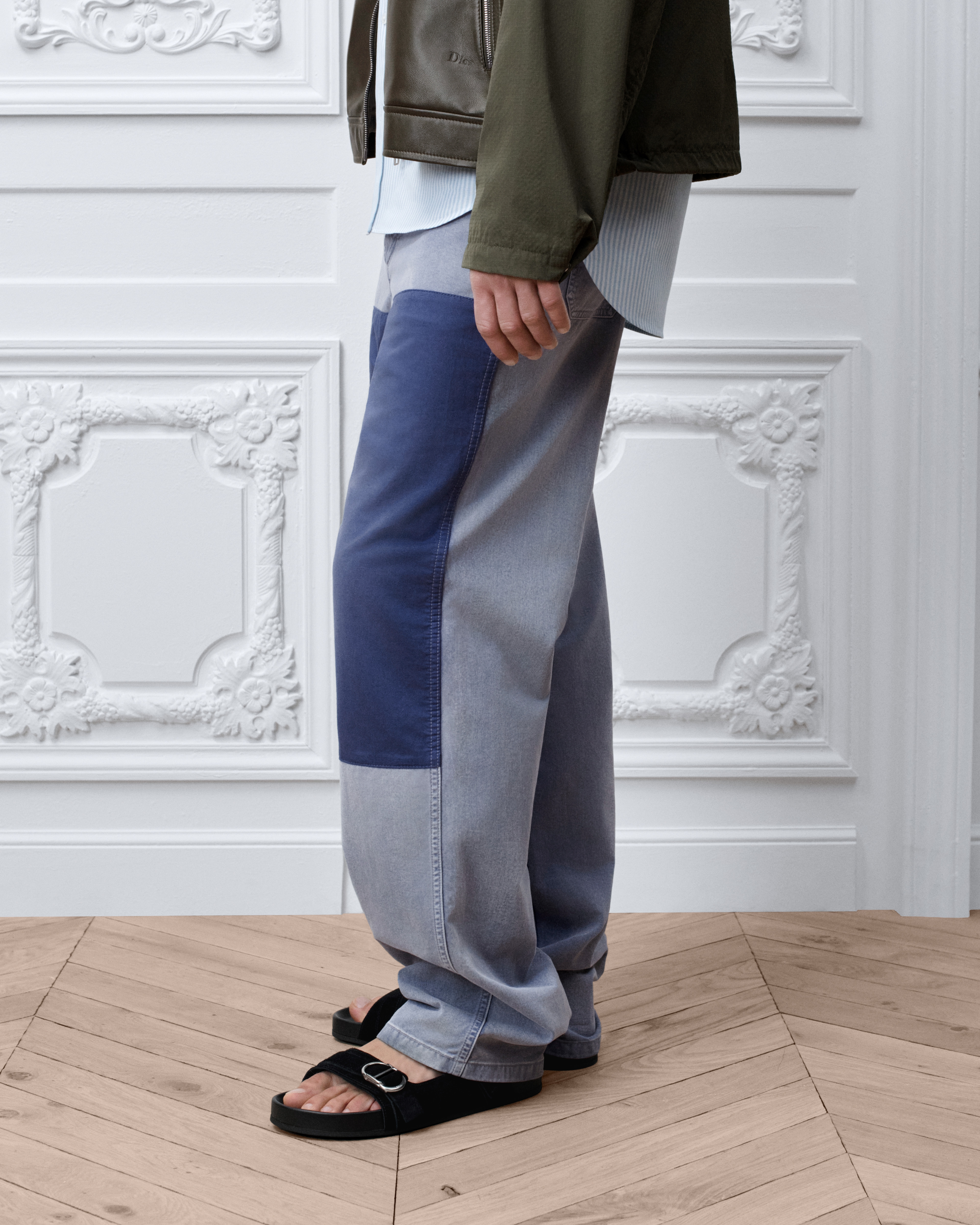 这款工装牛仔裤为实用的衣橱主打单品增添了时尚风范。采用蓝色棉质面料精心制作,膝盖处饰以拼饰风格拼接,搭配 Dior 皮革标牌和口袋缉面线,别具一格。可与夹克或卫衣搭配穿着,打造舒适造型。