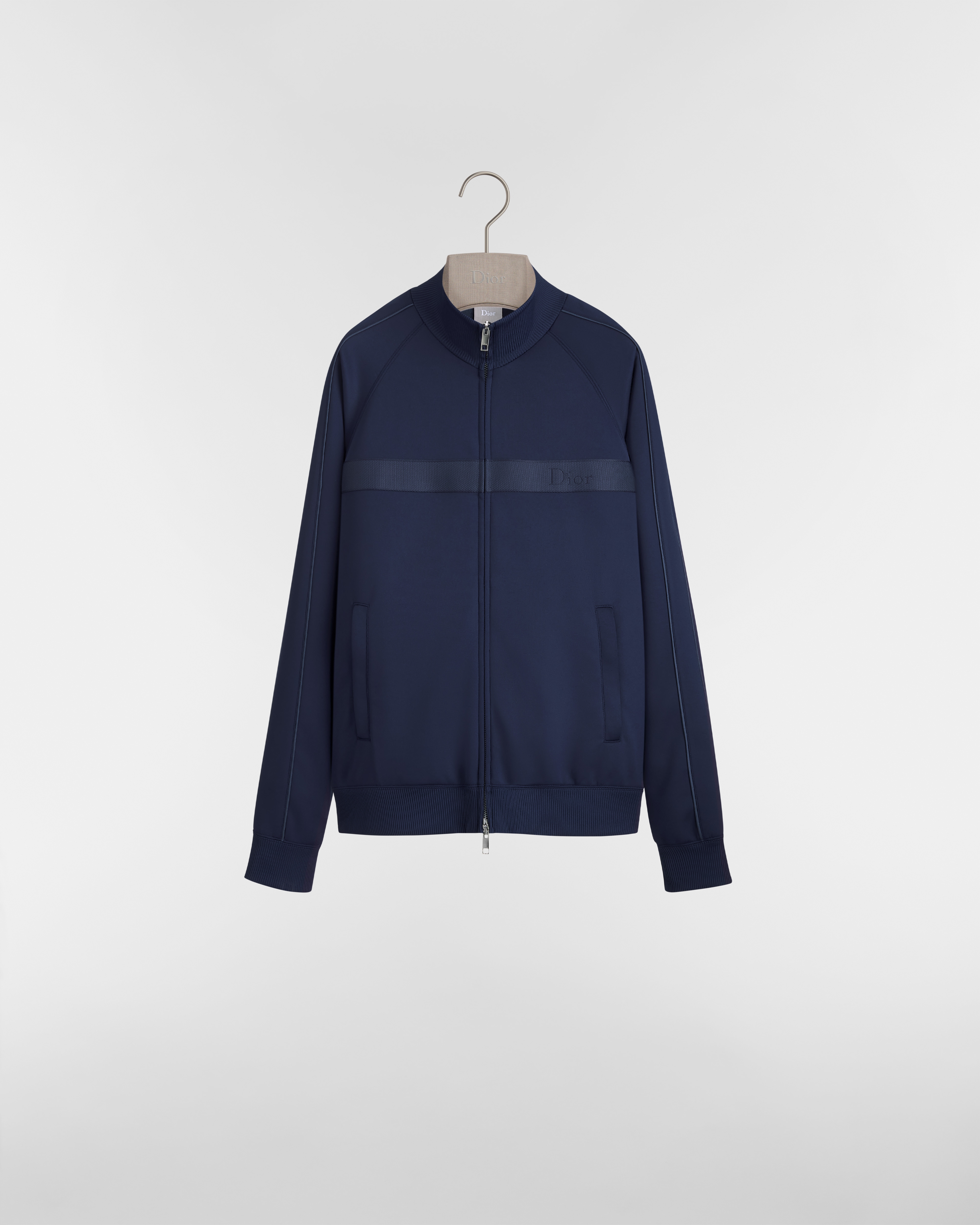 这款运动夹克将运动服饰与时尚风格巧妙融合。采用海军蓝色平纹针织科技面料精心制作,胸前饰以 Dior 提花条形图案,搭配侧面贴边口袋,别具一格。飘逸优雅版型,可与配套的短裤搭配穿着,打造精致的休闲造型。