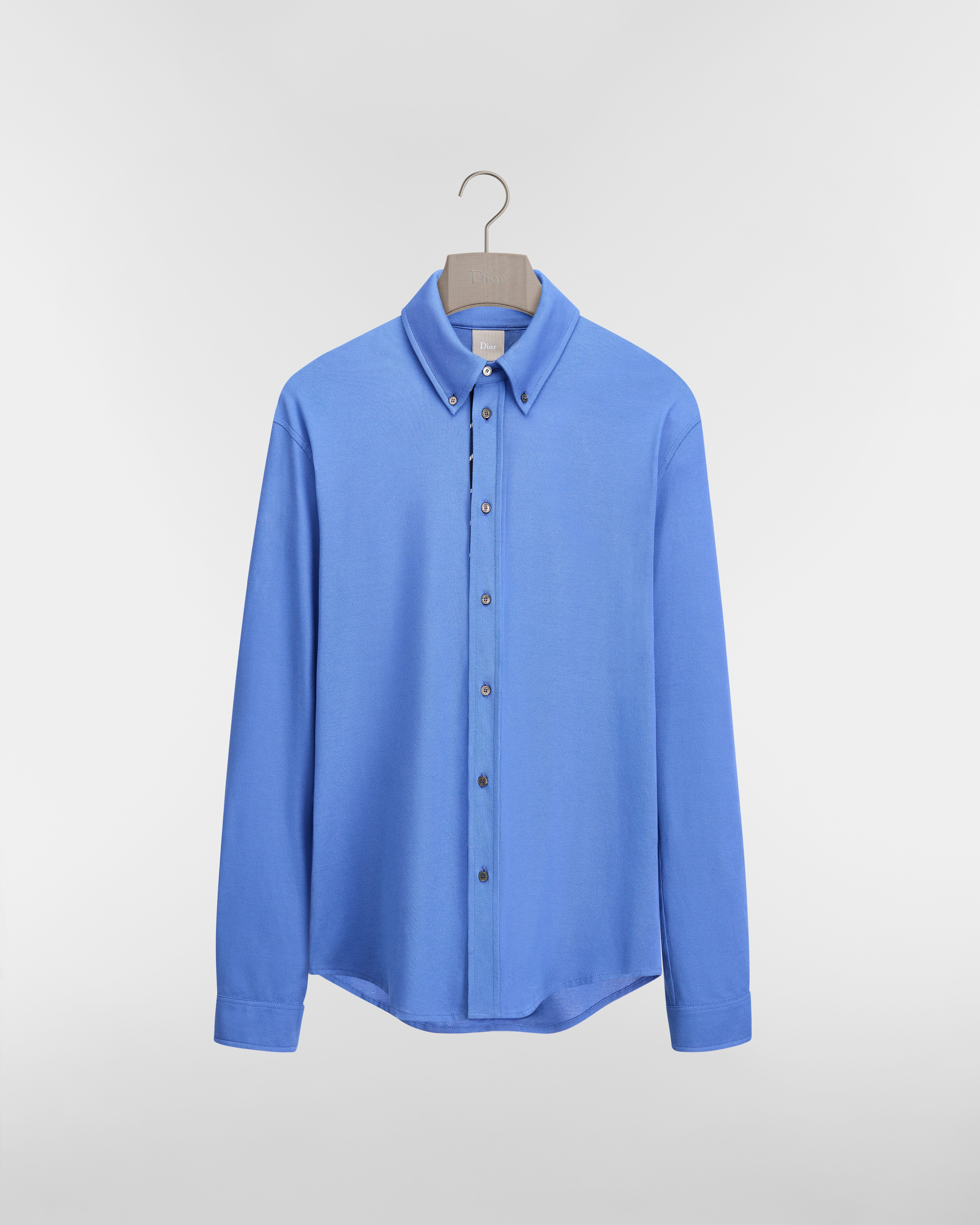 这款衬衫全新演绎经典的衬衫和领带搭配。采用古老而珍贵的蓝色海岛棉质珠地布面料精心制作,纽扣门襟饰以黑色和蓝色条纹 Dior Regimental 领带式细节。可敞开上方纽扣穿着,打造灵感源自传统的时尚精致造型。