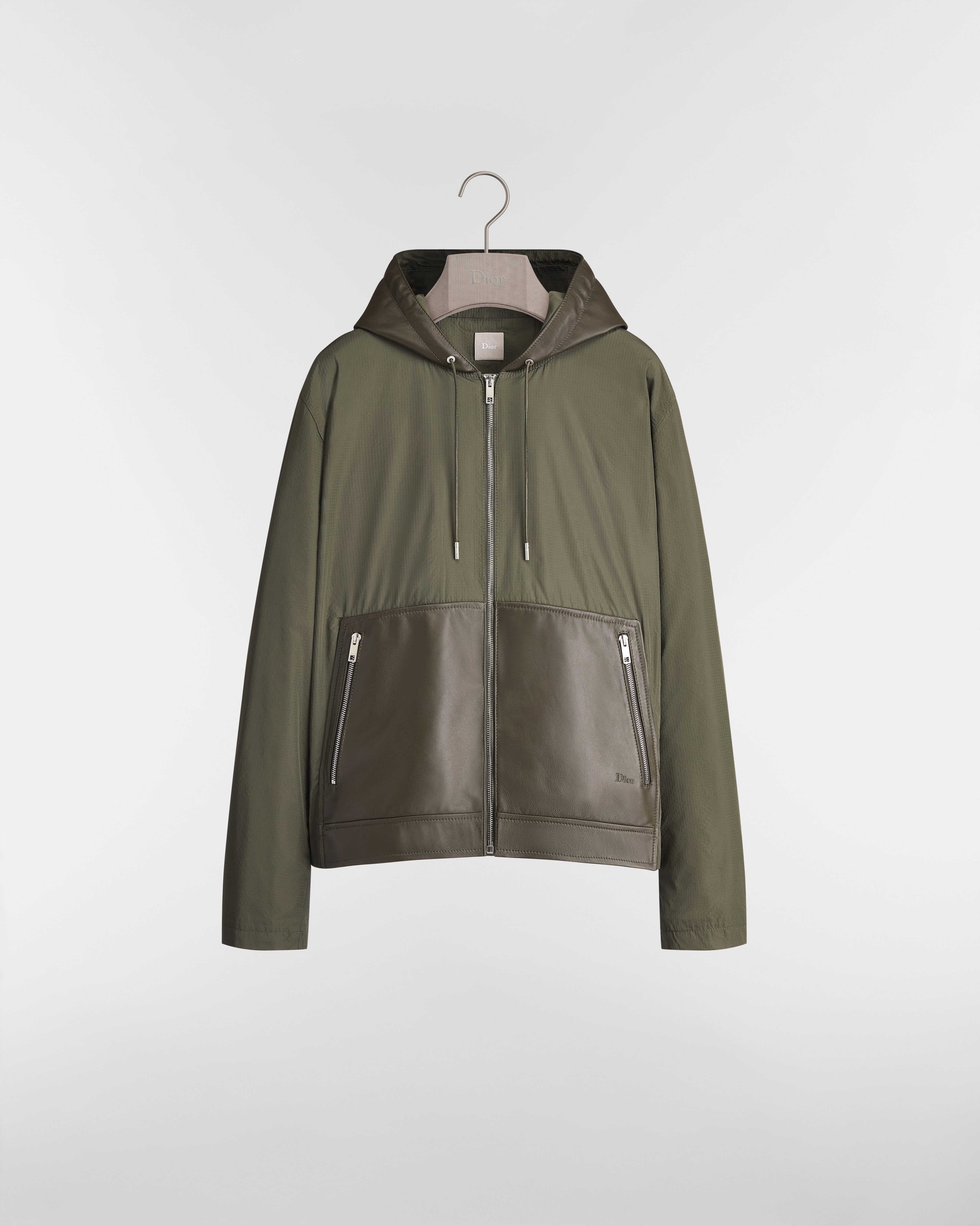 这款外套以不同面料演绎鲜明的对比。采用卡其色羊皮革和科技面料精心制作,经久耐穿又兼具优雅风范,风帽饰以 Dior 皮革标牌,大号羊皮革拉链口袋饰以 Dior 凹印标志,提升格调。实用且优雅,可搭配运动服饰造型。