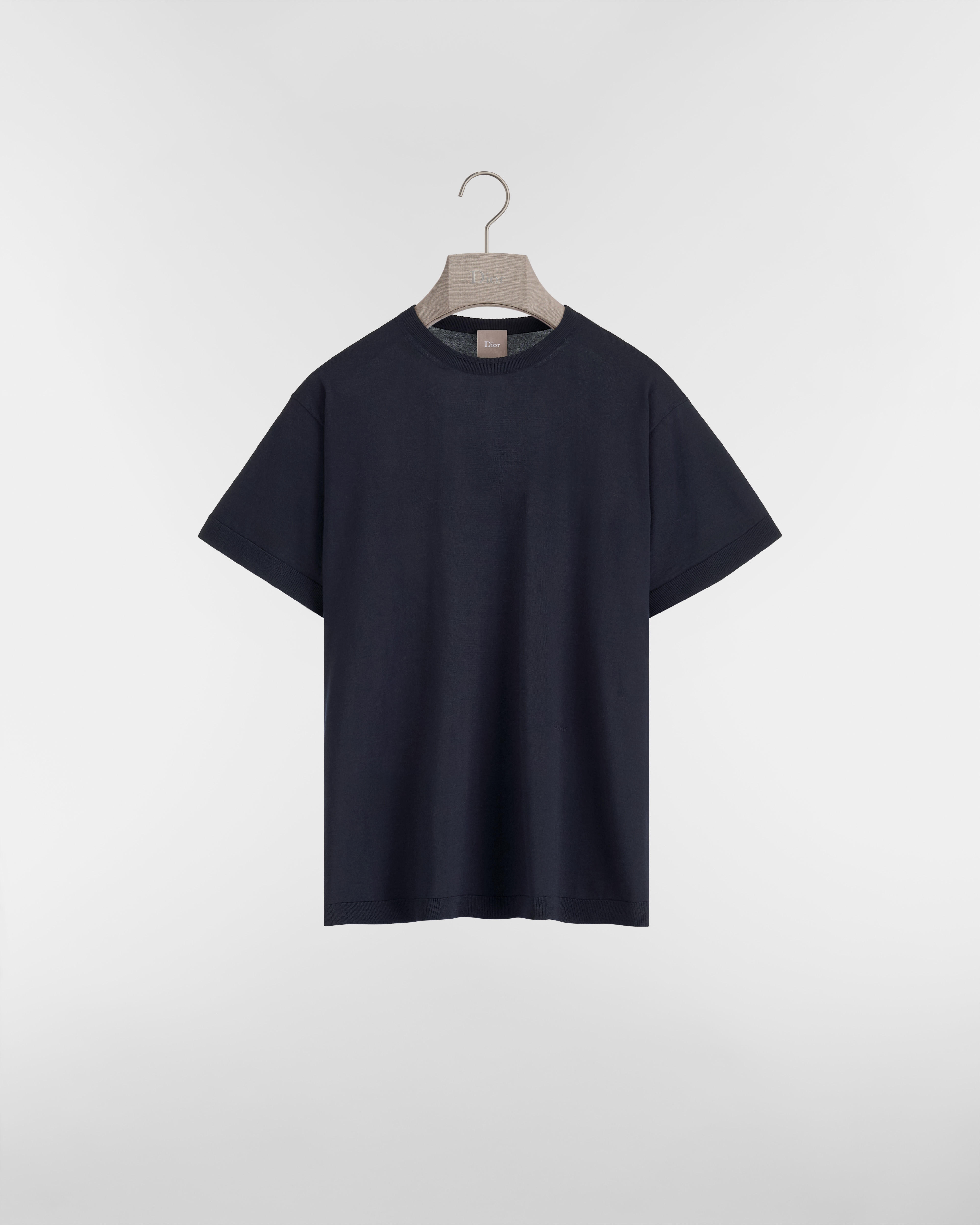 这款 T 恤以优雅舒适的面料重新诠释。采用海军蓝色绵羊毛和桑蚕丝混纺针织面料精心制作,搭配罗纹圆领、袖口和底边,正面饰以同色调 Dior 刺绣。可与该系列的飘逸针织短裤搭配,打造时尚的运动服饰廓形。