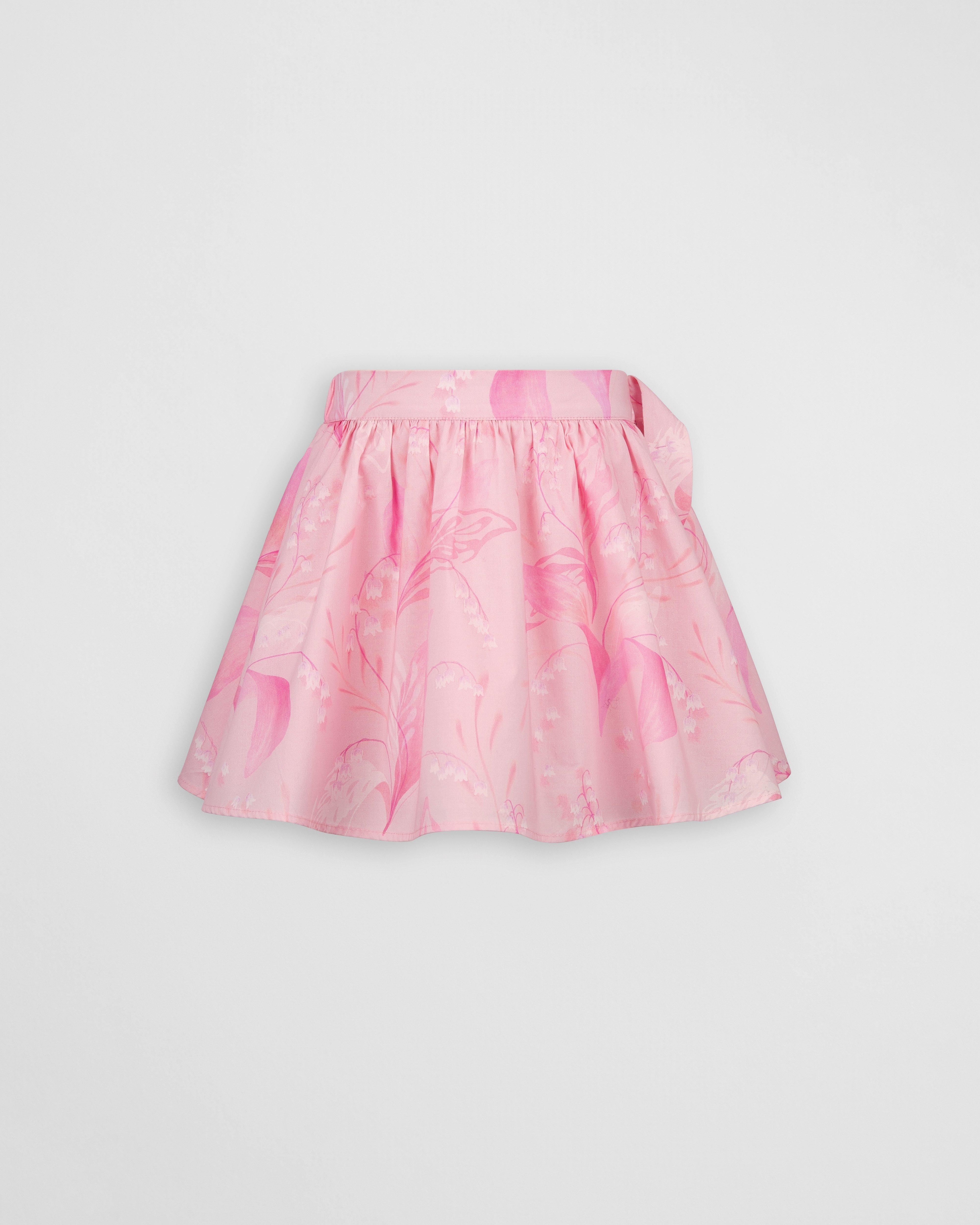 这款半身裙饰以铃兰图案,以经典的幸运之花向 Dior 先生对大自然的热爱致敬。采用粉色棉府绸精心制作,饰以同色调印花,侧面点缀以蝴蝶结,后侧弹力腰头设计,舒适合身。下摆饰以 Dior 标志刺绣,可与该系列的配套无袖衬衫搭配穿着,打造愉悦活泼的造型。
