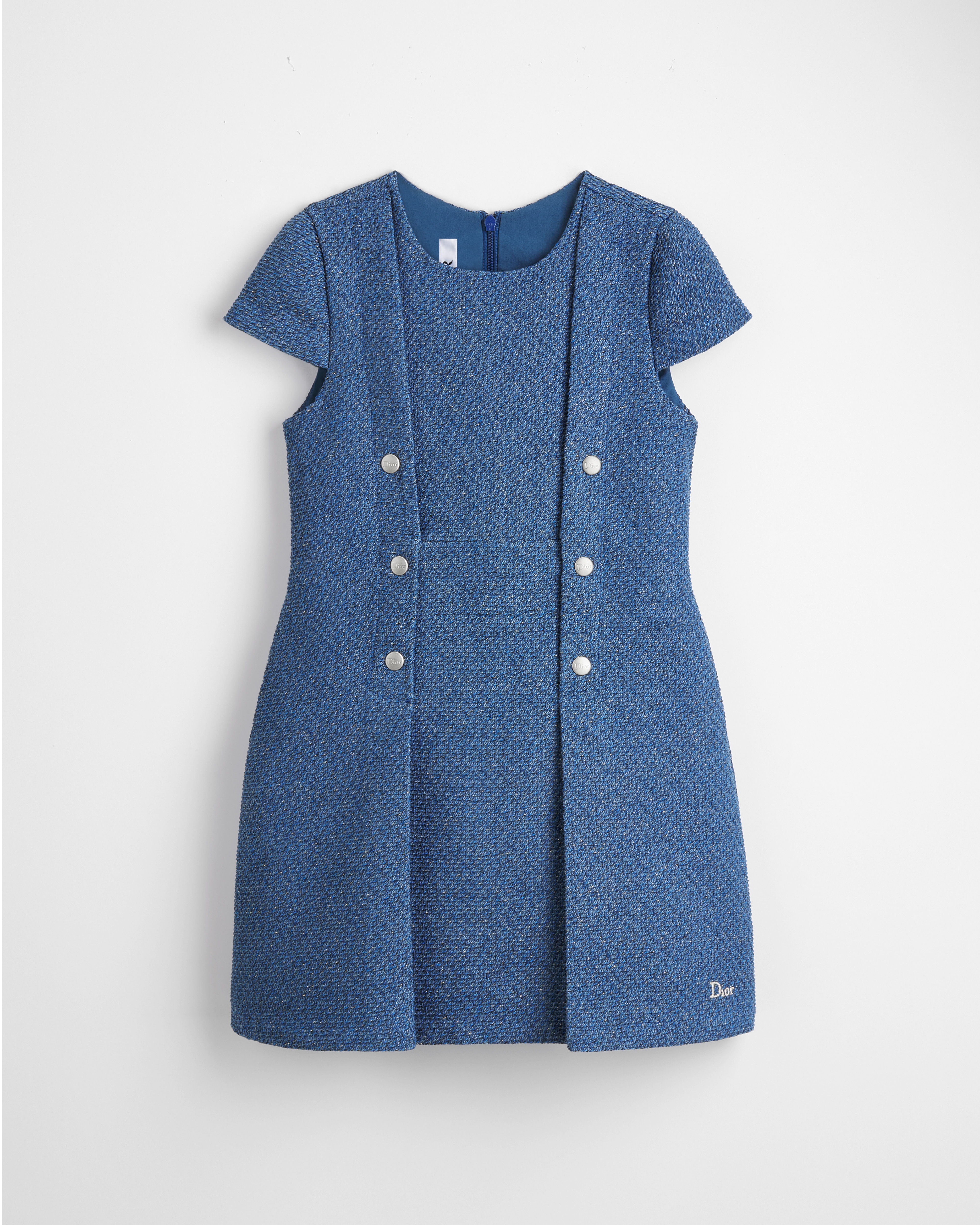 这款连衣裙是二零二六夏季童装系列新品,展现创新面料,别具一格。采用蓝色棉质混纺牛仔面料精心制作,饰以同色调提花编织,点缀以金色金属光泽线,彰显粗花呢效果。正面饰以褶裥,后侧公主线接缝为廓形增添层次感。带有两排装饰性纽扣,搭配接缝口袋和后侧隐藏式拉链开合。底部饰以 Dior 刺绣提升格调,可与该系列的配套经典西装外套搭配,打造精致经典造型。