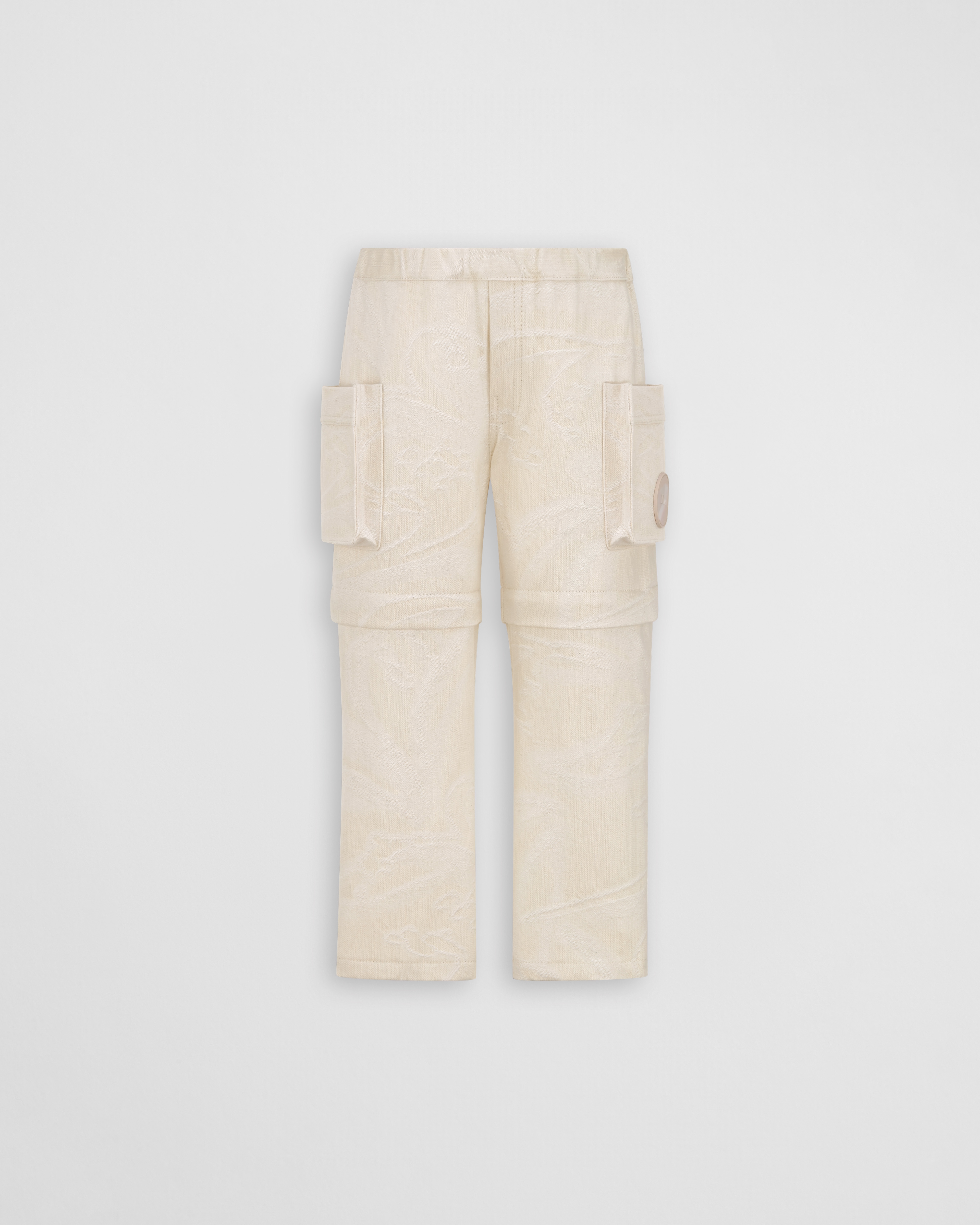这款工装裤是二零二六夏季系列新品,饰以朦胧效果铃兰图案,以经典的幸运之花向 Dior 先生对大自然的热爱致敬。采用象牙色棉质混纺华达呢面料精心制作,饰以同色调提花图案,二合一款式搭配隐藏式拉链,可将长裤变为短裤。其中一个侧面贴袋饰以点缀以凸起 Dior 标志的橡胶补丁,提升格调。搭配弹力腰头,打造理想的贴合度,可与该系列的配套夹克搭配,打造本季理想的街头服饰造型。