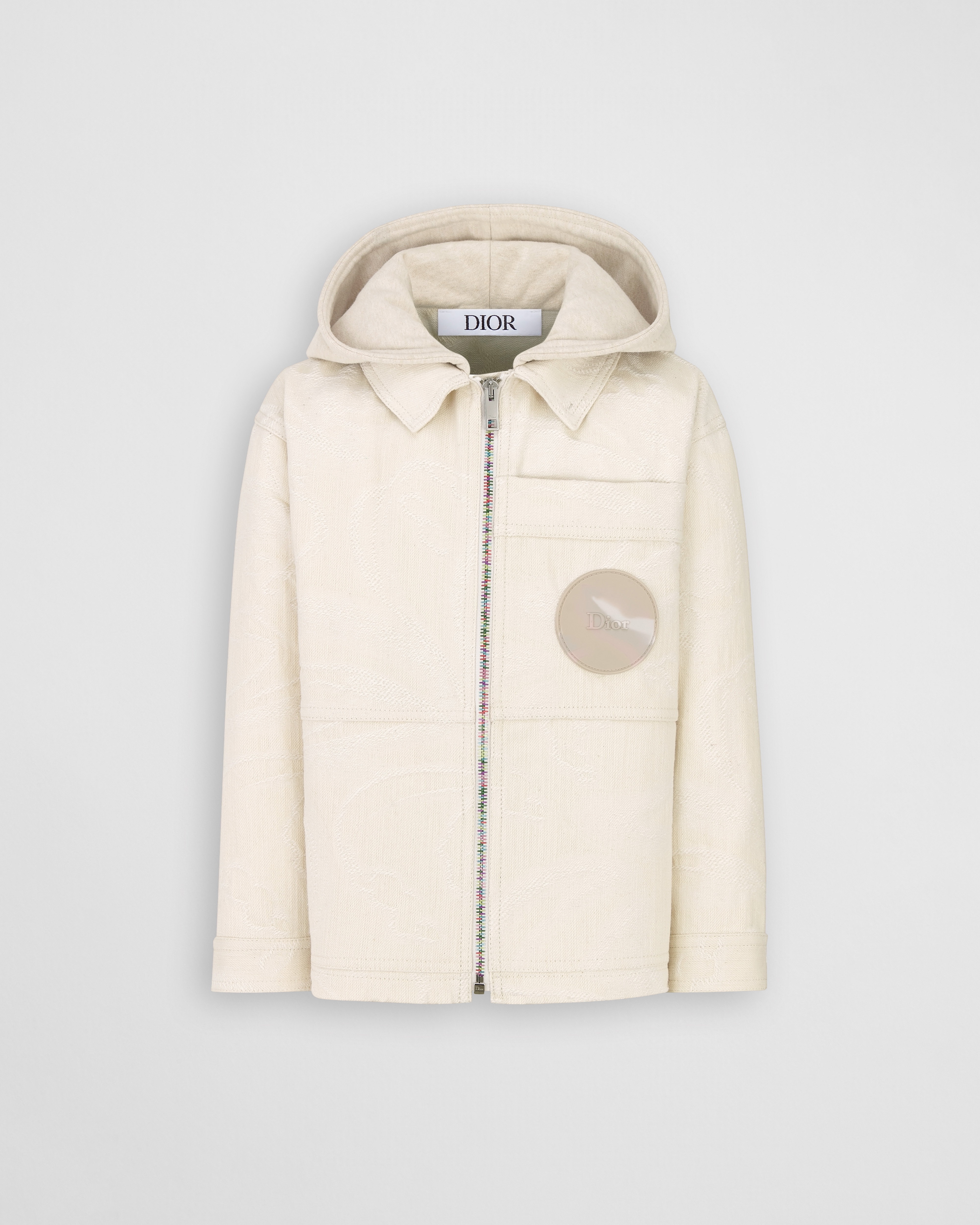 这款夹克是二零二六夏季系列新品,饰以朦胧效果铃兰图案,以经典的幸运之花向 Dior 先生对大自然的热爱致敬。采用象牙色棉质混纺华达呢面料精心制作,饰以同色调提花图案,搭配错视效果风帽和充满趣味的多色拉链开合,别具一格。设有多个口袋,其中一个饰以点缀以凸起 Dior 标志的橡胶补丁。款式轻盈,宽角领设计,可与该系列的配套工装裤搭配,打造适合本季穿着的街头服饰造型。