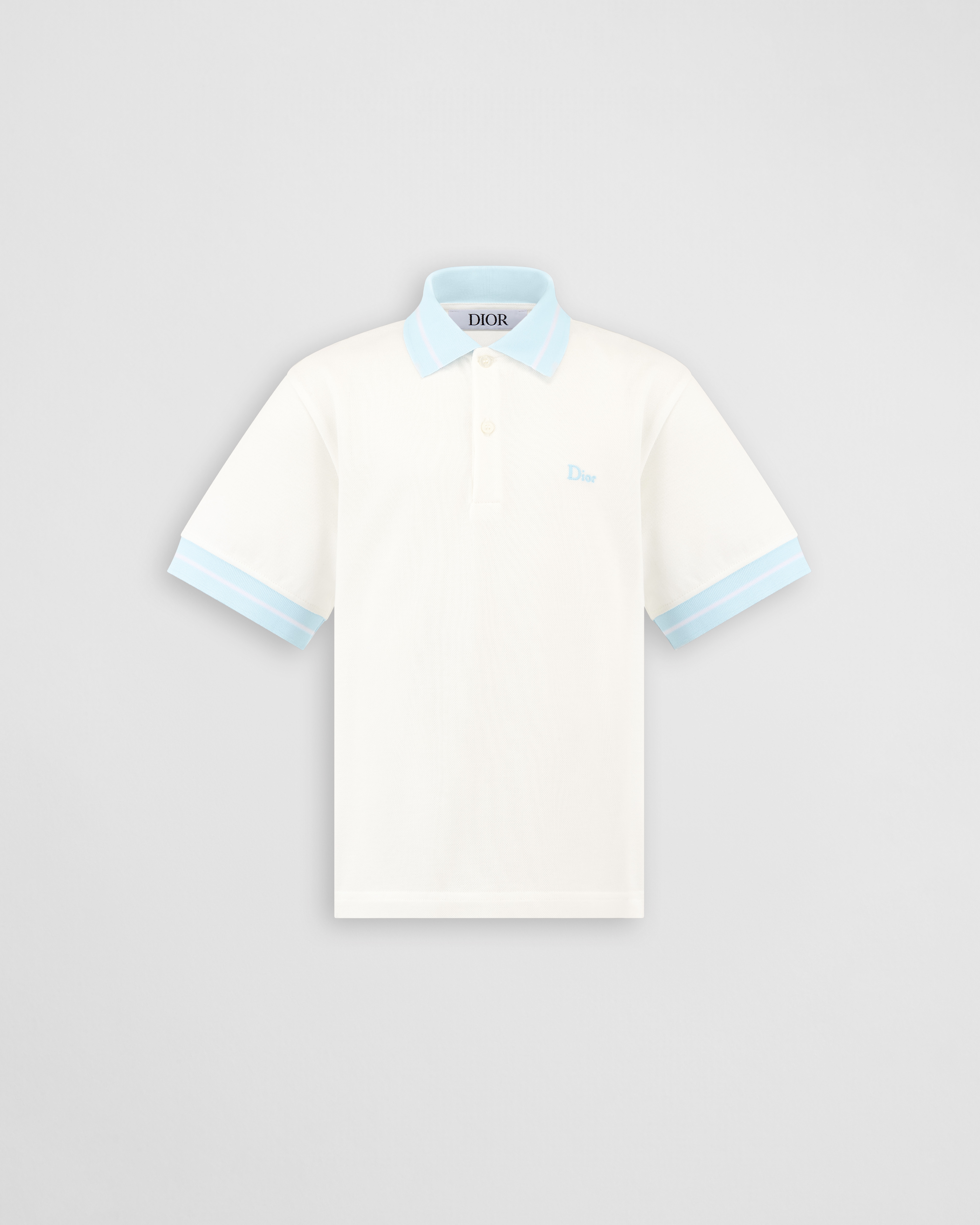 这款 Polo 衫突显本季配色,打造经典造型。采用象牙色棉质珠地布精心制作,搭配淡蓝色罗纹宽角领和袖口,饰以对比鲜明的饰边,更显格调。衣领纽扣门襟,正面饰以 Dior 刺绣提升格调。可与该系列的长裤搭配,打造经典造型。