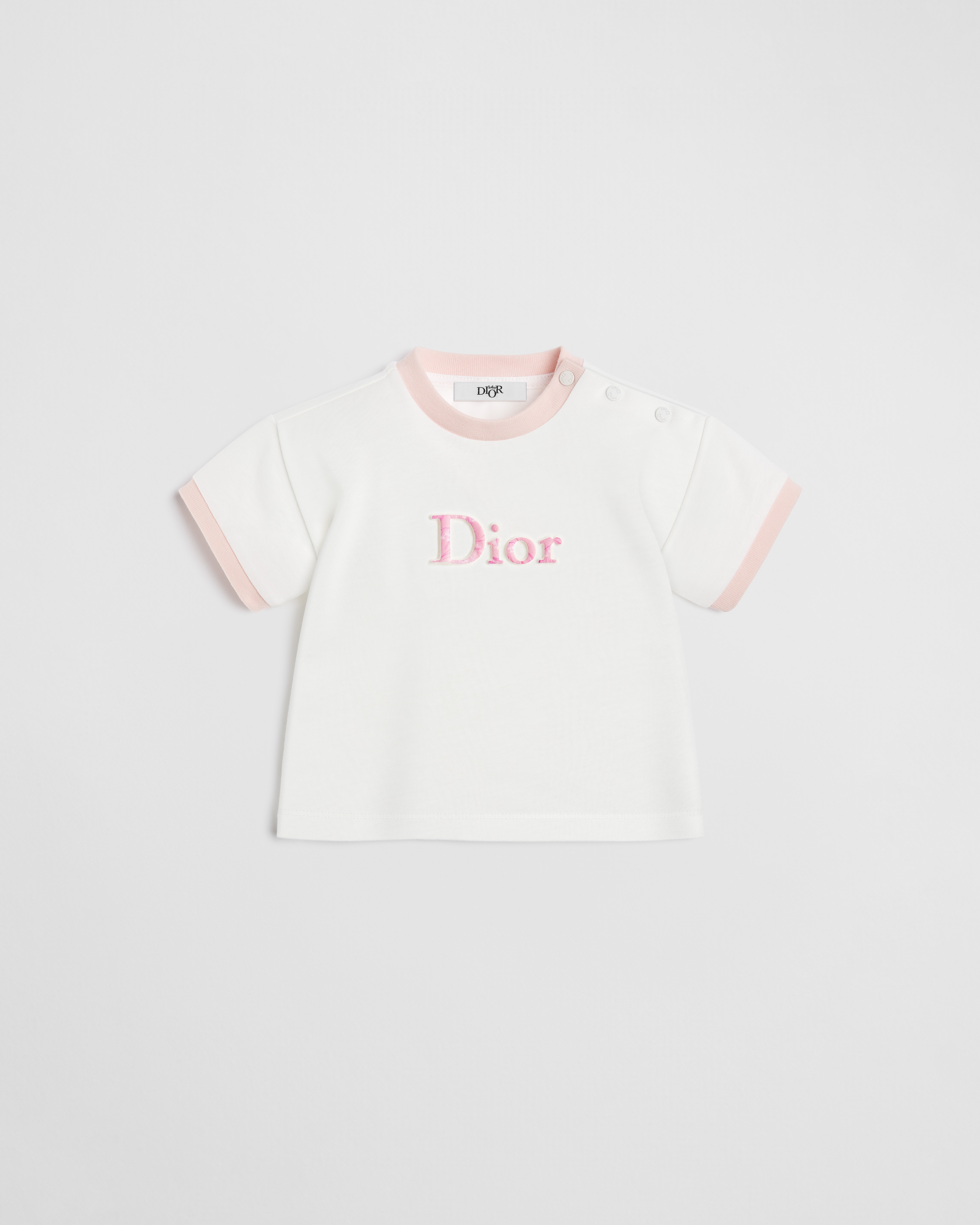 这款 T 恤以当季配色彰显精致廓形。采用象牙色棉质平纹针织面料精心制作,正面饰以粉色 Dior 凸印标志和铃兰图案提升格调。搭配淡粉色罗纹圆领和衣袖饰边,肩部按扣开合设计,易于穿脱。可与该系列的半身裙搭配穿着,打造清新的造型。