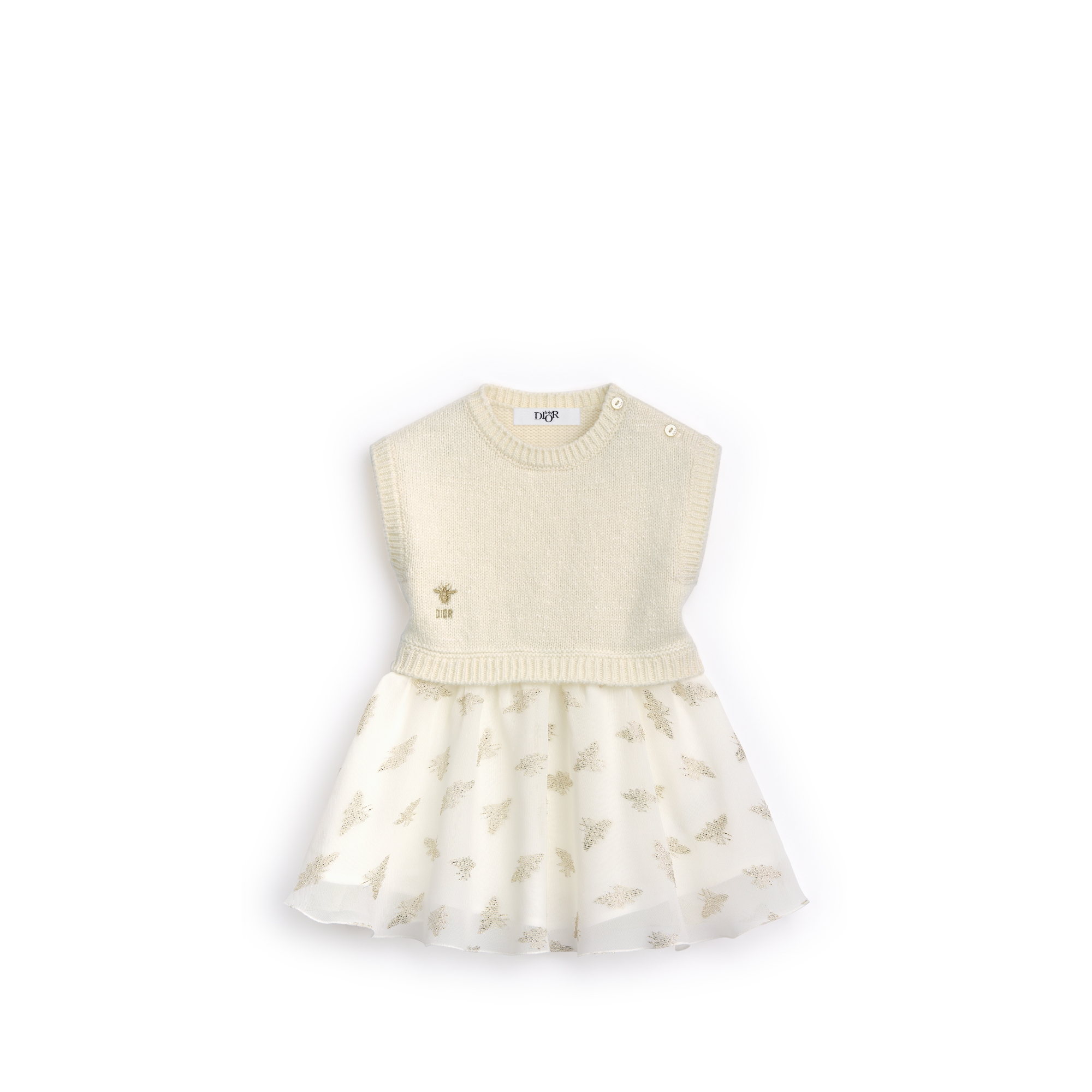 象牙色绵羊毛和桑蚕丝混纺针织面料和象牙色轻薄面料金色调提花小蜜蜂图案
