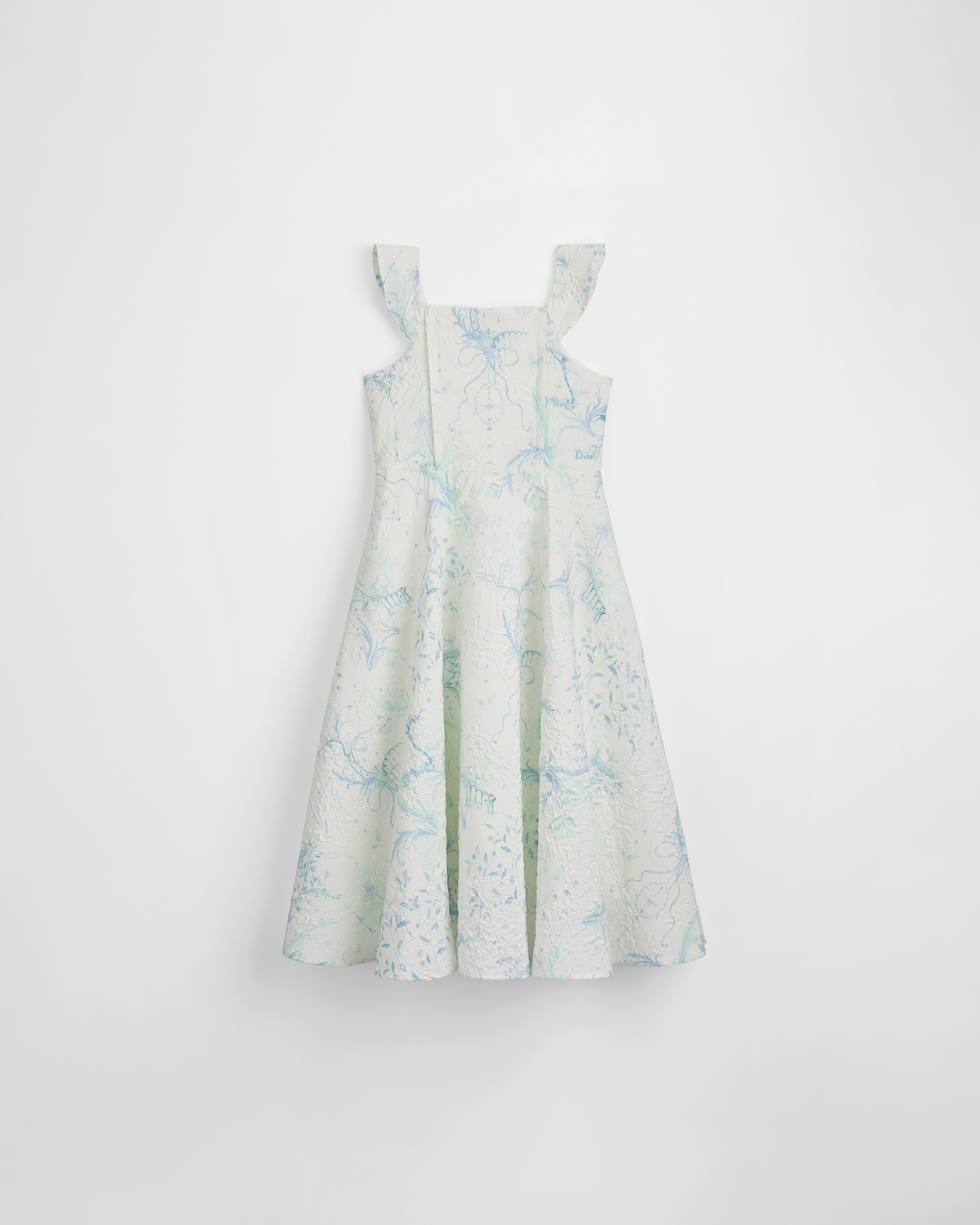 这款连衣裙以优雅的版本全新演绎 Dior 经典的茹伊印花,灵感源自 18 世纪风格。采用象牙色面料精心制作,饰以蓝色和绿色凸印印花,别具一格的凸起纹理彰显个性风范。修身版型搭配小巧的盖袖彰显丰盈感,背面拉链开合搭配珠光纽扣提升格调。腰部点缀以蓝色 Dior 标志刺绣,可与该系列的凉鞋搭配,打造时尚造型。