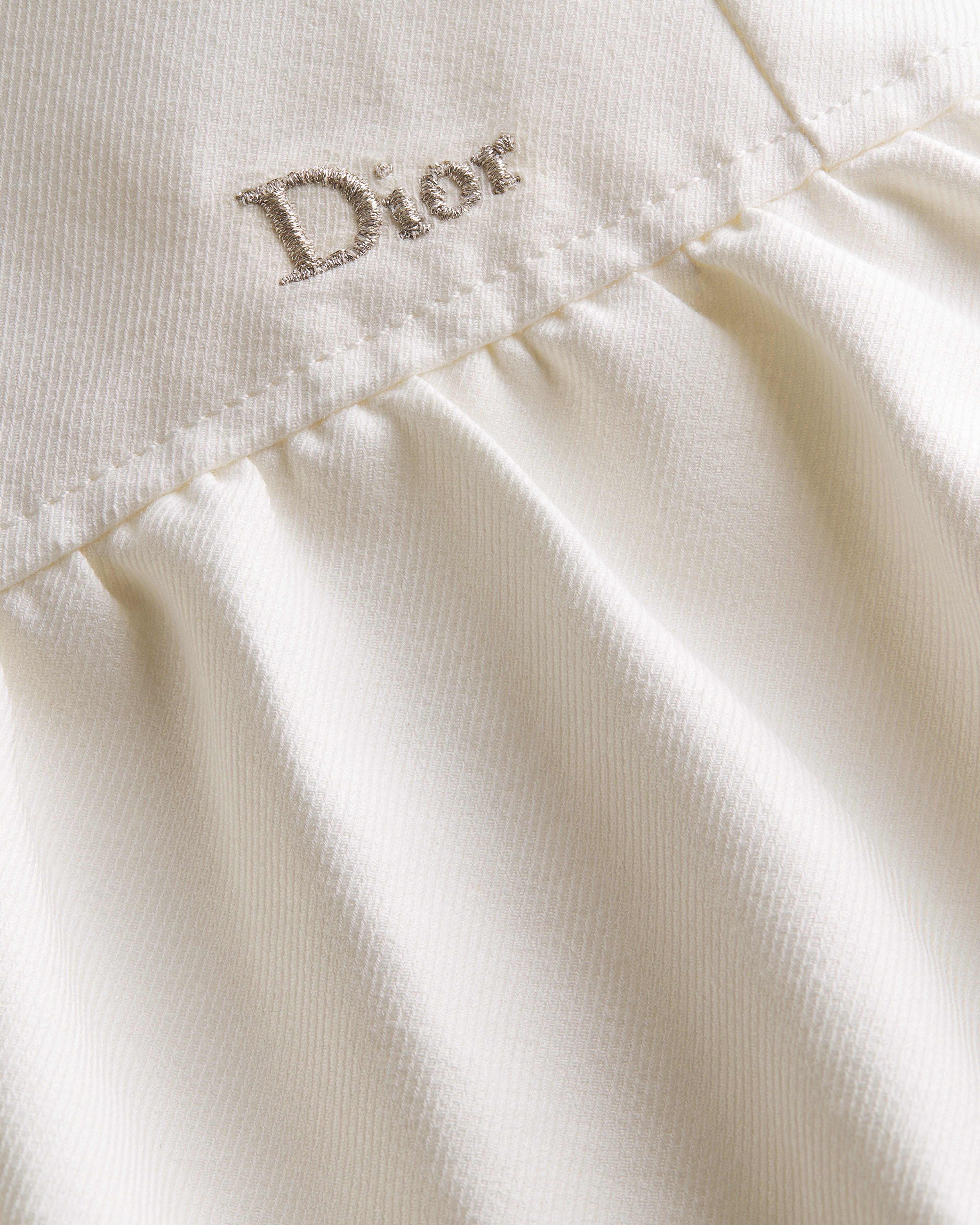 这款连衣裙是二零二六秋季童装系列新品,低腰和气球版型半身裙设计别具一格。采用象牙色棉质华达呢精心制作,搭配腰带环和正面按扣。腰部饰以银色调 Dior 刺绣,可与该系列的配套外套搭配,打造充满趣味的造型。