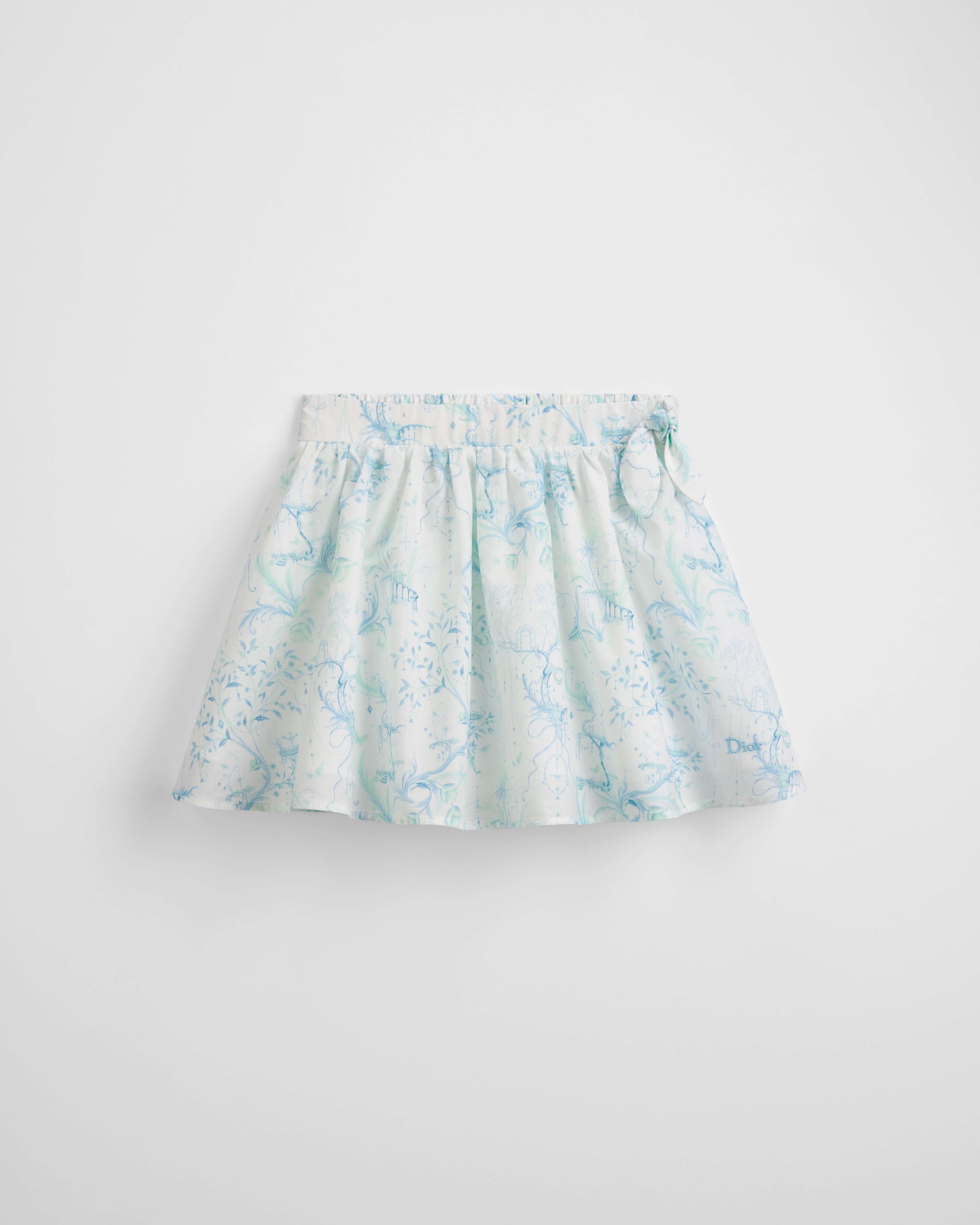 这款半身裙以优雅的版本全新演绎 Dior 经典的茹伊印花,灵感源自 18 世纪风格。采用象牙色棉府绸面料精心制作,饰以蓝色和绿色印花,侧面点缀以蝴蝶结,搭配后侧弹力腰头,打造理想贴合度。下摆饰以蓝色 Dior 标志刺绣,可与该系列的背心搭配,打造清新的造型。