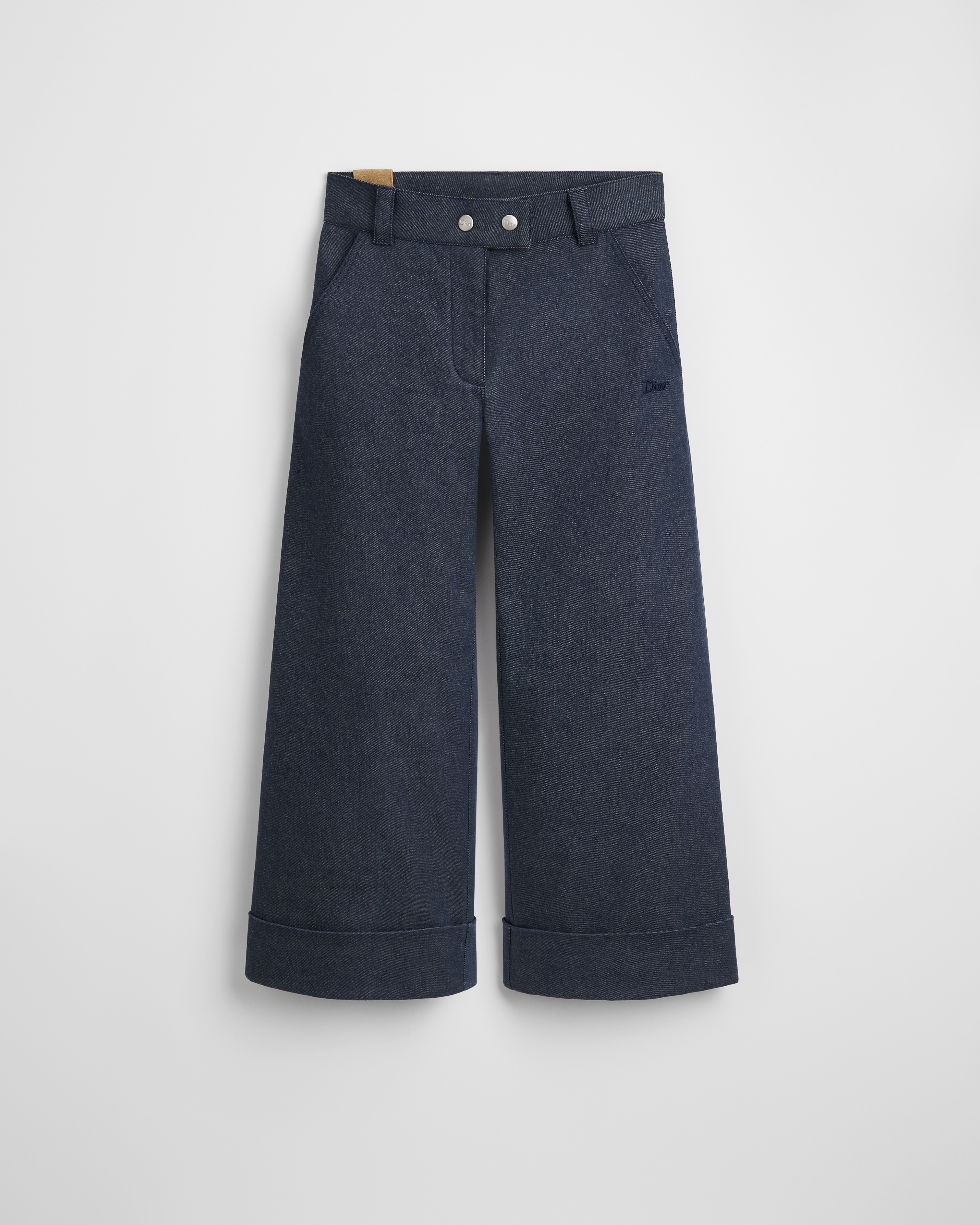 这款牛仔裤是 Dior 衣橱的经典单品,彰显阔腿和动感剪裁。采用蓝色棉质混纺牛仔布精心制作,搭配斜插口袋、两个后侧口袋和双按扣开合。背面饰以 Dior 绒面革标牌,裤脚固定卷边彰显原创的美学风格。饰以同色调 Dior 刺绣提升格调,可与该系列的夹克搭配,打造充满趣味的精致造型。