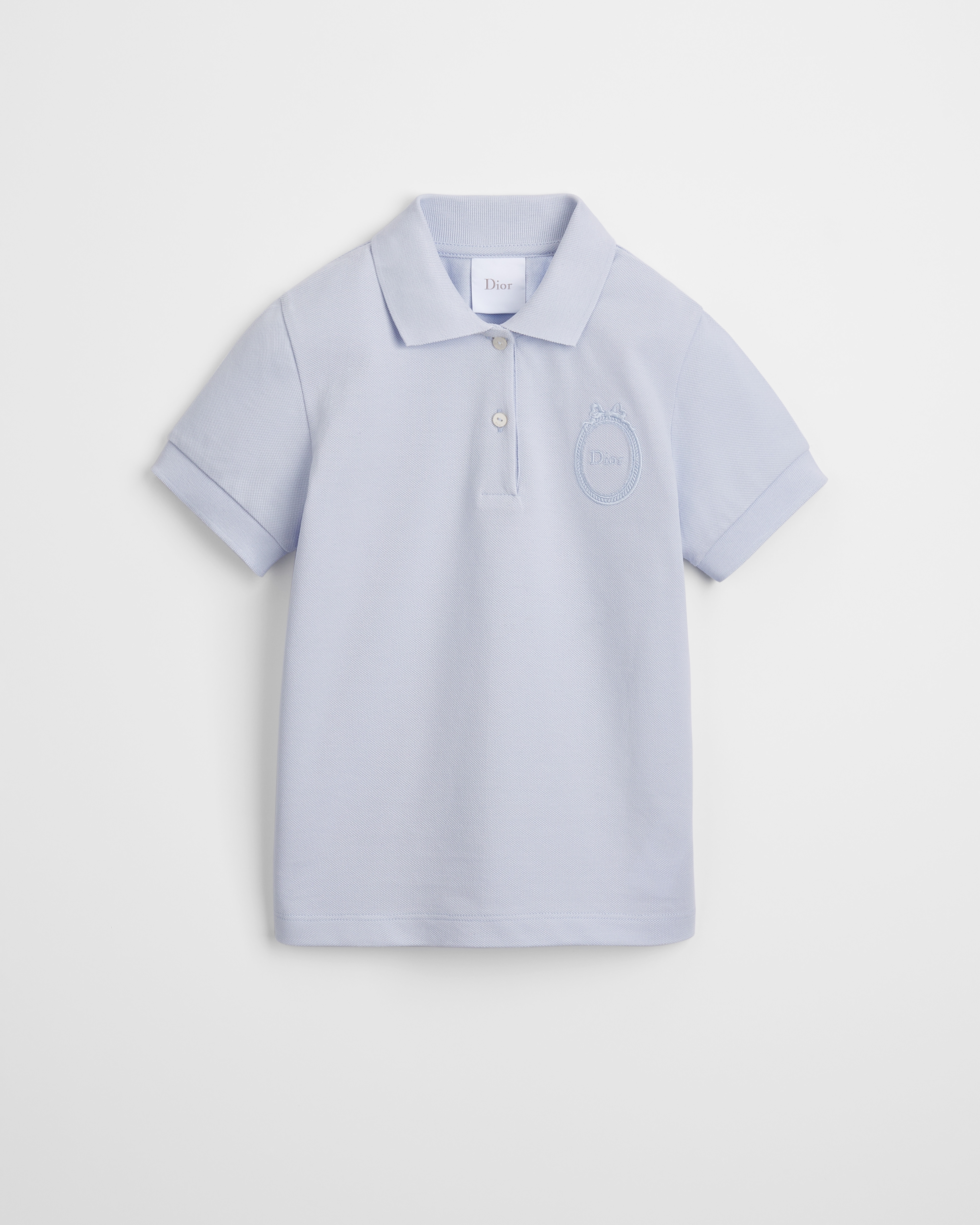 宽角领搭配镌刻有 Dior 标志的白色纽扣开合