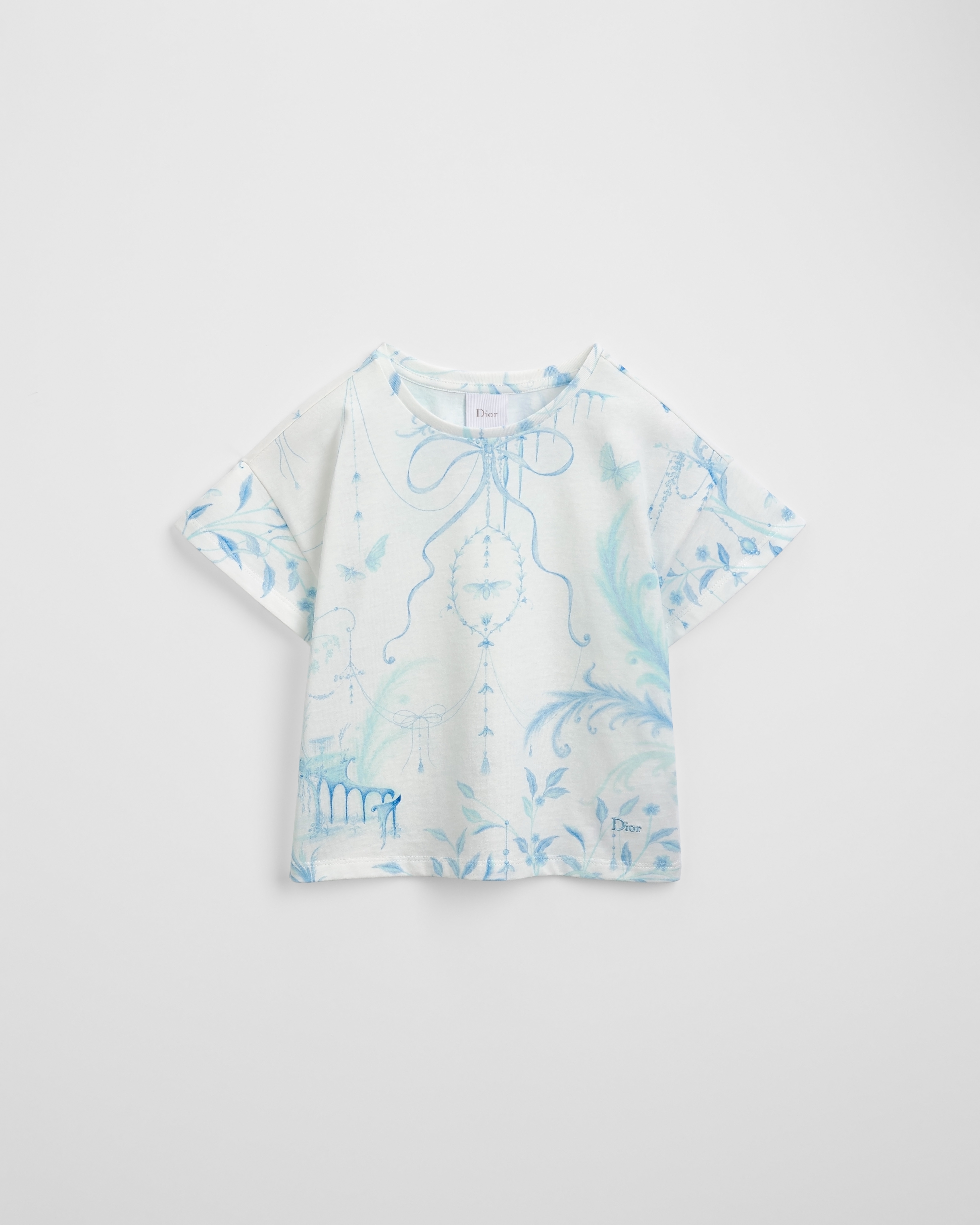 这款 T 恤以优雅的版本全新演绎 Dior 经典的茹伊印花,灵感源自 18 世纪风格。采用象牙色棉质平纹针织面料精心制作,饰以蓝色和绿色印花,下摆饰以蓝色 Dior 标志刺绣。罗纹圆领设计,可与该系列的长裤或半身裙轻松搭配,打造时尚休闲的造型。